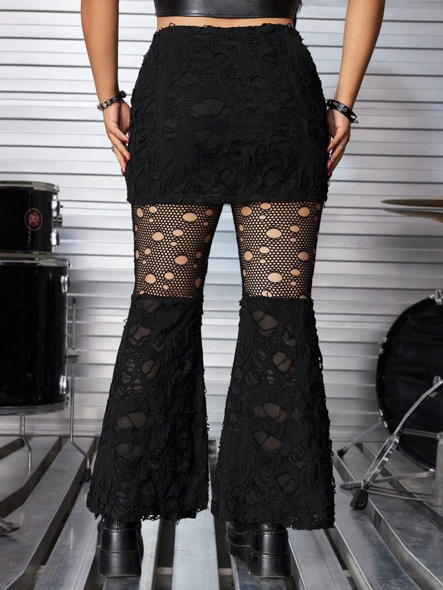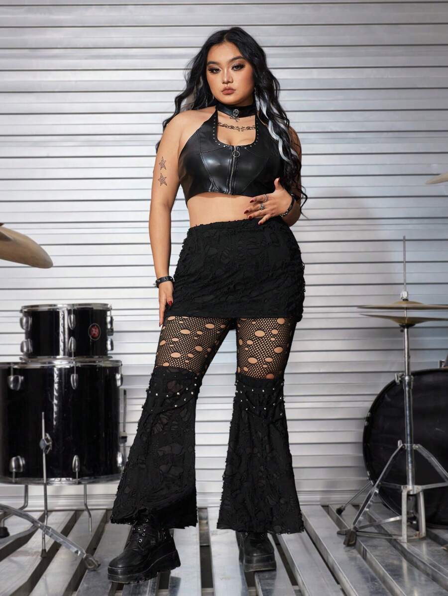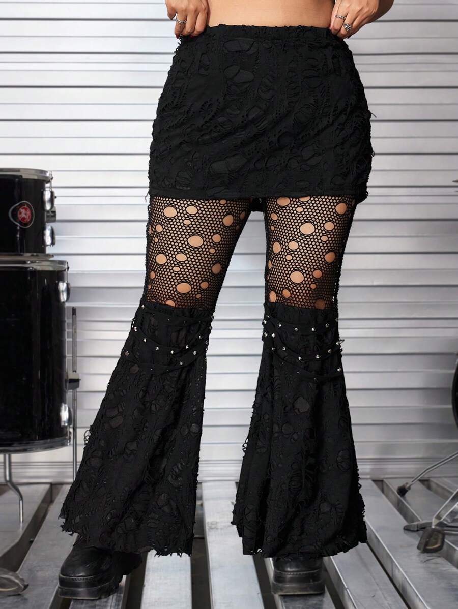 Grunge Punk Plus Size Women Gothic Punk Style Distressed Fishnet Patchwork Rivet Decor Flare Pants For Summer