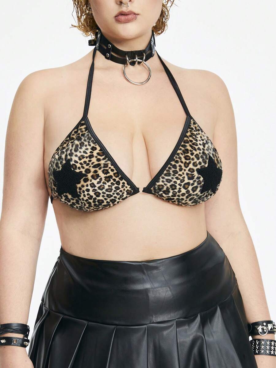 Grunge Punk Plus Size Women's Dark Punk Leopard Pattern Star Print Triangle Cup Halter Top With Tie