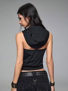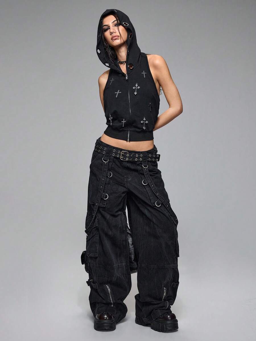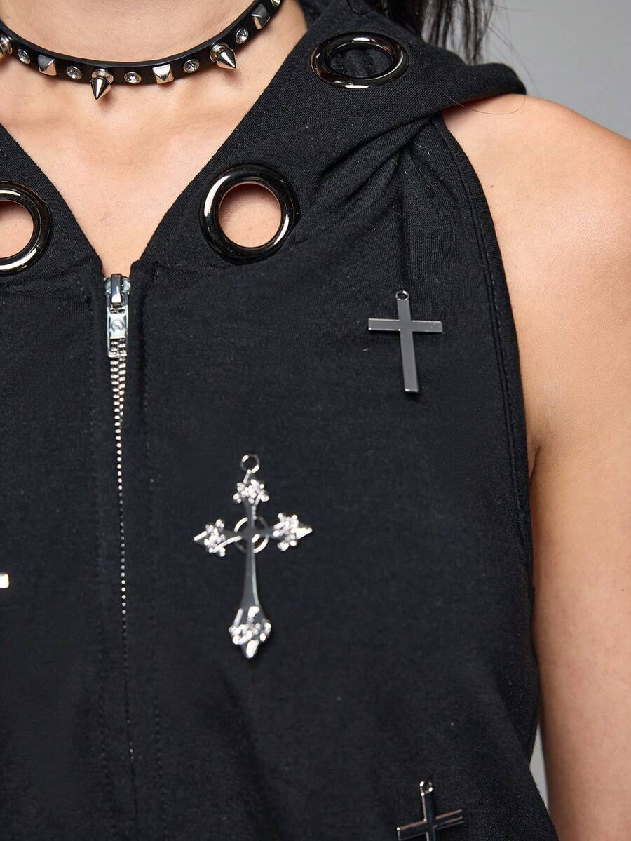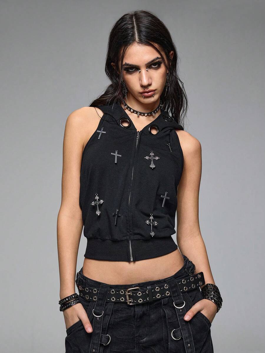 Grunge Punk Punk Metal Cross Eye Sleeveless Cropped Hoodie Top For Women