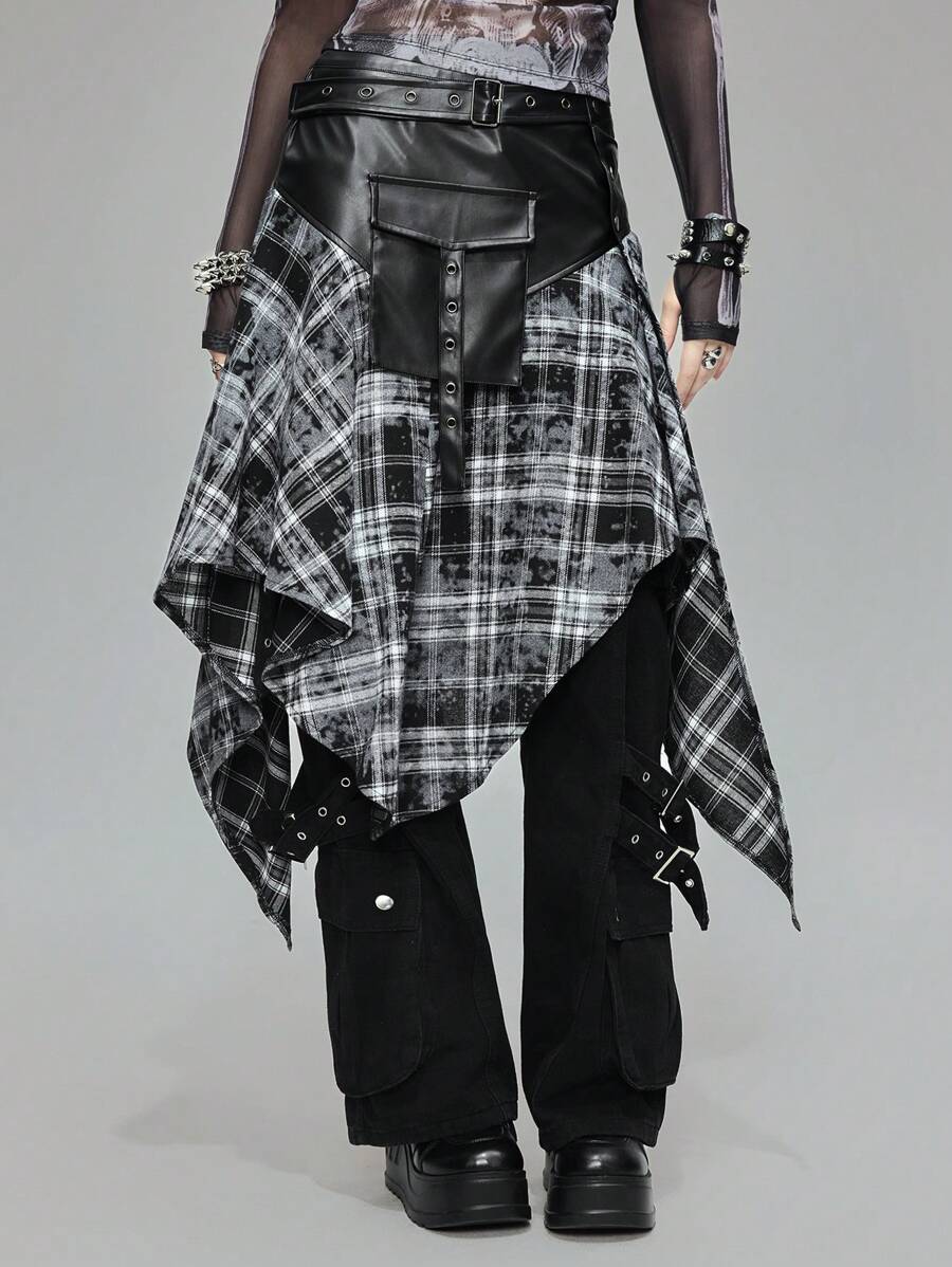 Grunge Punk Punk Red And Black Plaid Patchwork PU Asymmetrical Hem Skirt