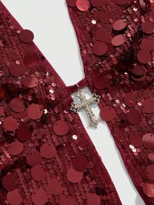 Grunge Punk Punk Rock Diva Party Outfit, Festival Music Event New Year Costume, Halter Neck Sexy Sequin Cross Pendant 2 Pieces Set For Women