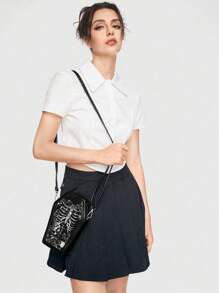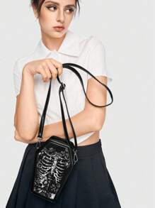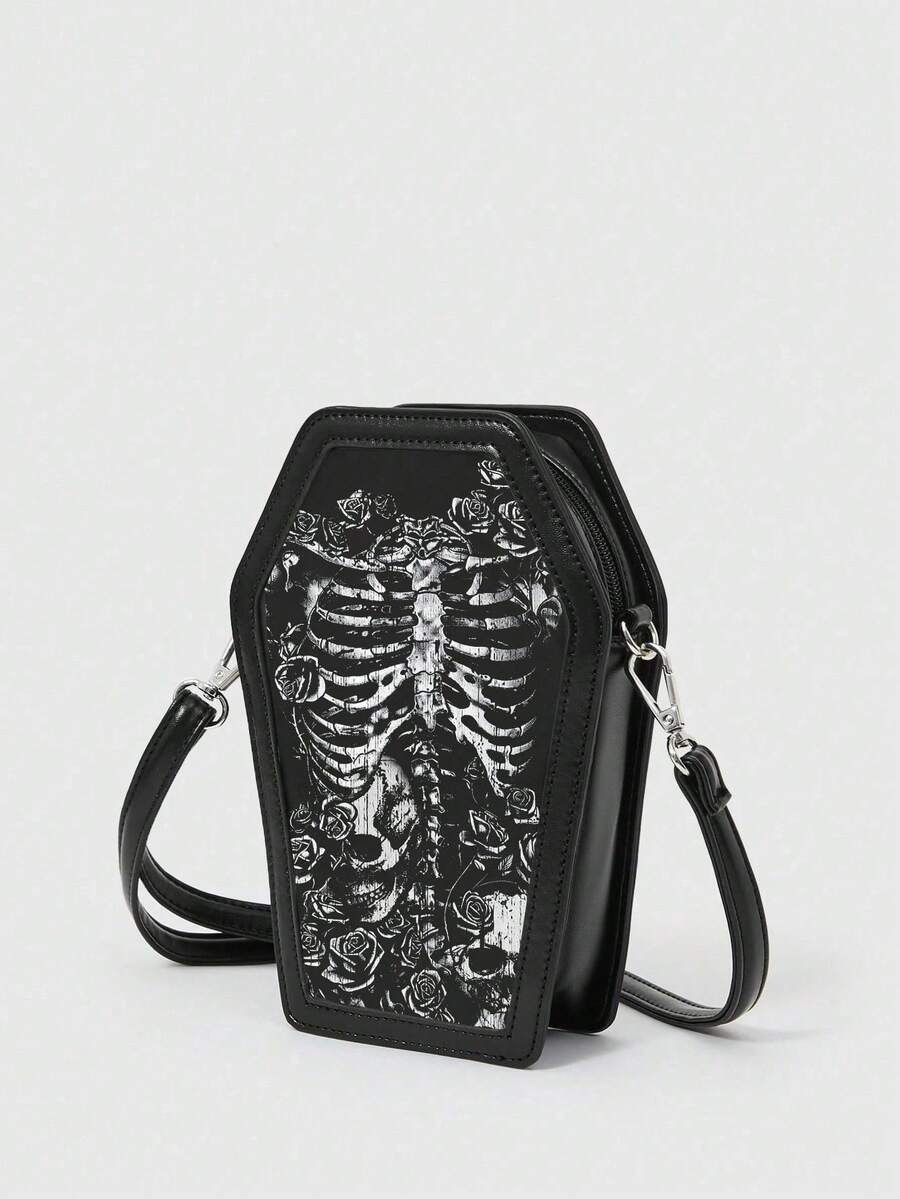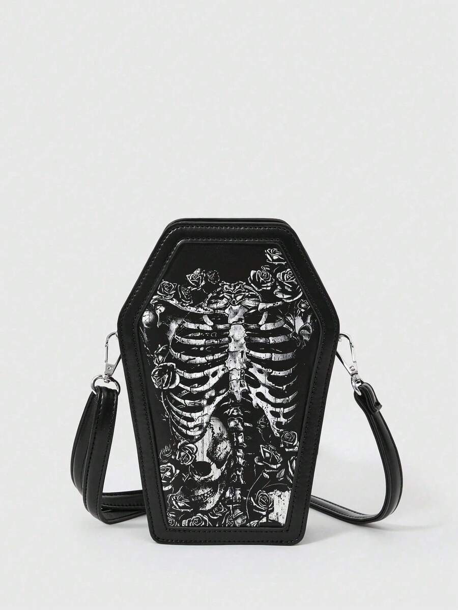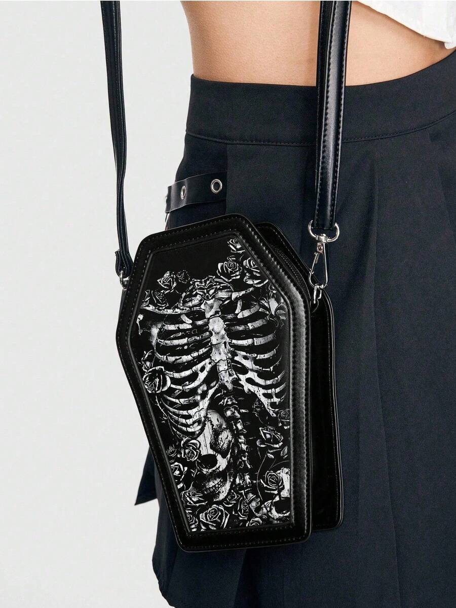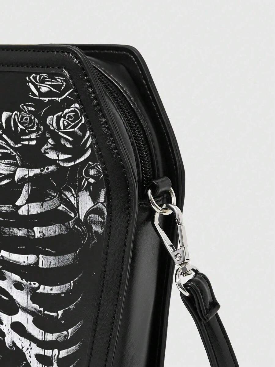 Grunge Punk Punk Skull Rose Coffin Shape Shoulder Bag, Gothic Y2K Party & Travel Crossbody Bag, Halloween, Halloween Bags Perfect For Fancy Party Matching With Halloween Costumes
