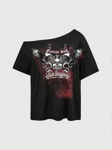 Grunge Punk Punk Skull Slogan Red Black White Print Eagle Party Music Festival Sexy Asymmetrical Shoulder Black Solid Basic Summer Casual Street Vintage Plus Size Asymmetrical Shoulder T-Shirt