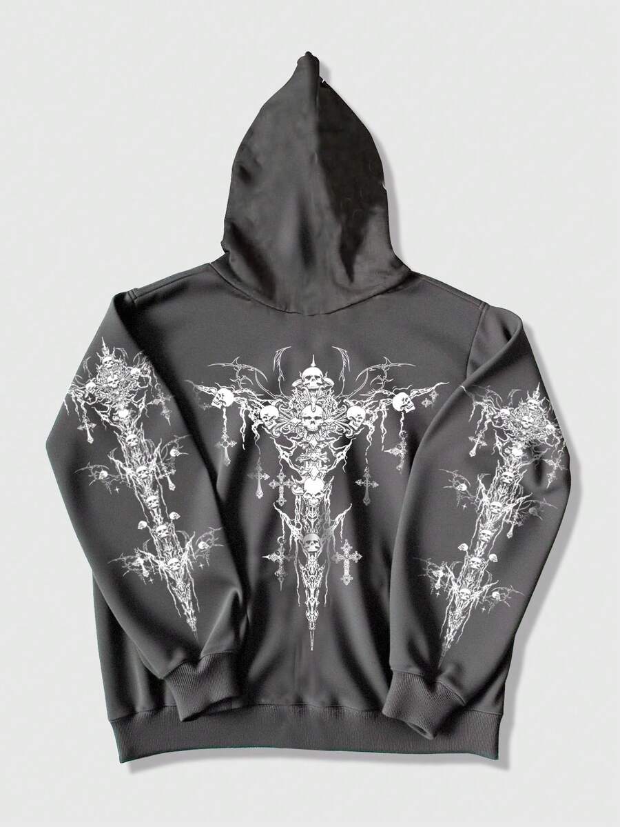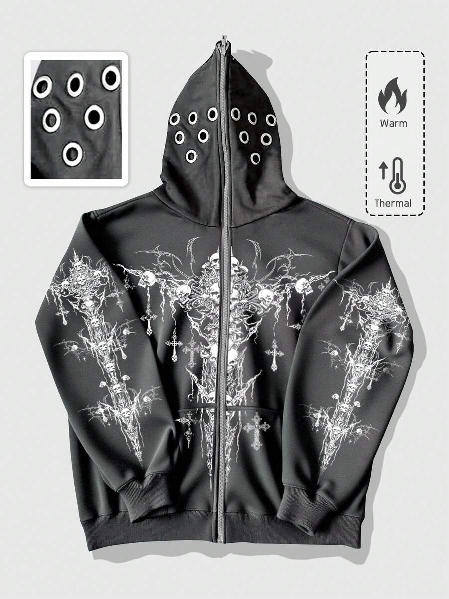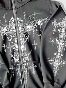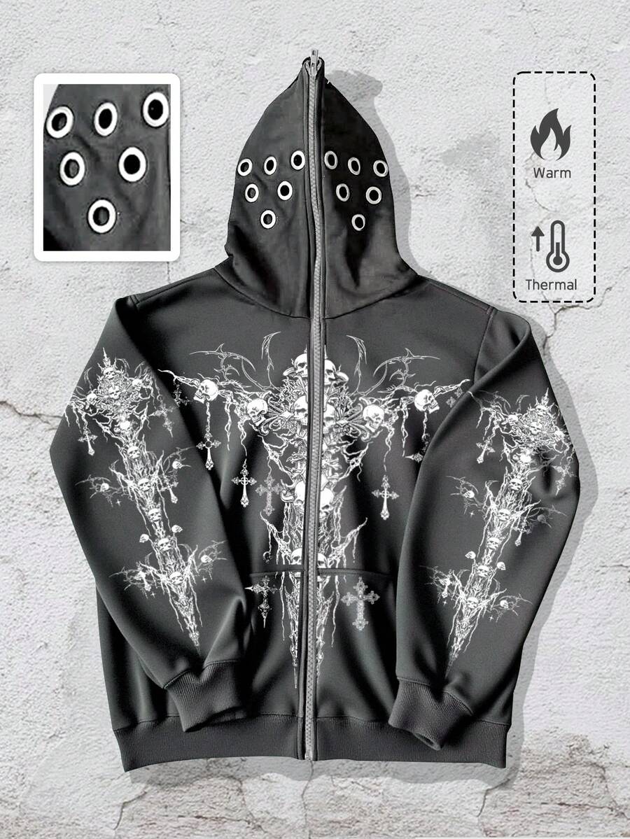 Grunge Punk Punk Street Style Hooded Zip-Up Thermal Lined Sweatshirt Jacket, Autumn/Winter