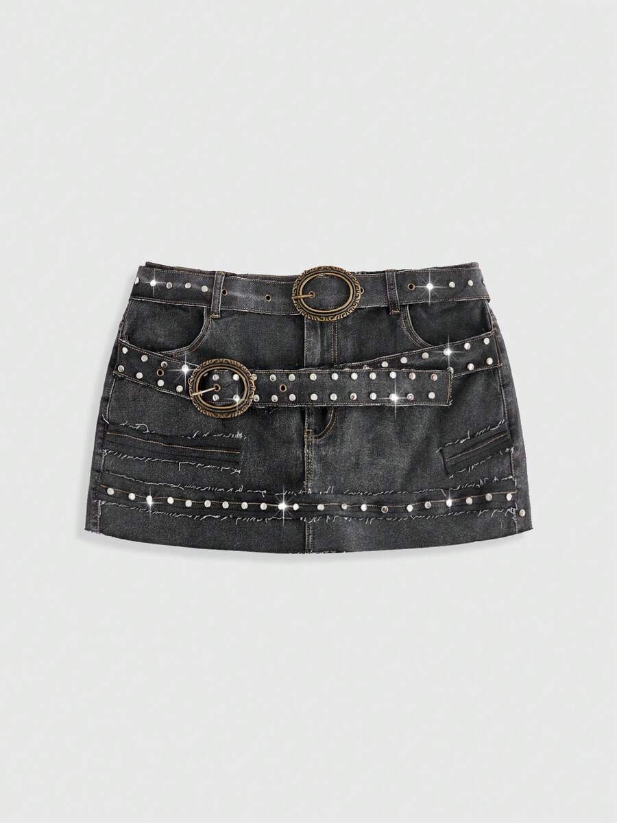 Grunge Punk Grunge-Punk Rivet Distressed Vintage Denim Skirt With Belt, Plus Size