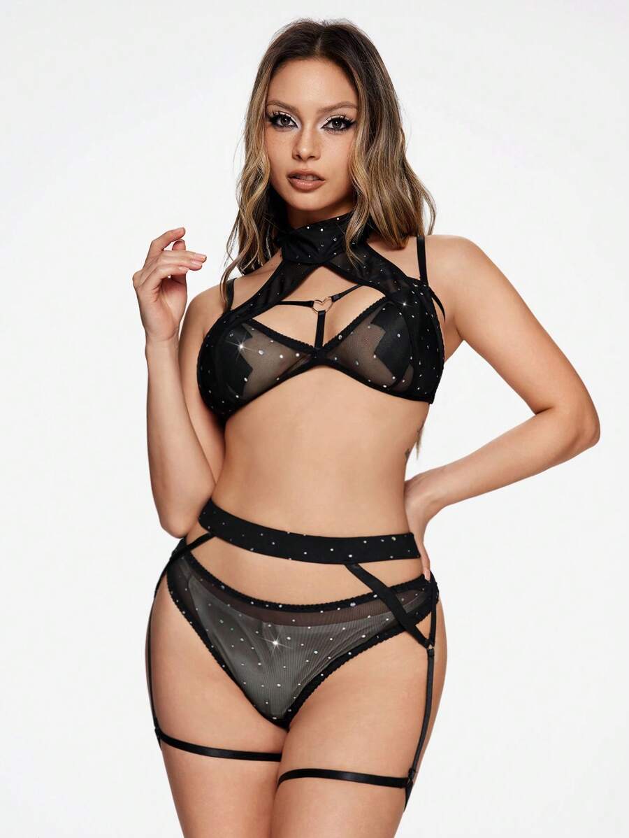 Grunge Punk Romantic Dark Glitter Heart Metallic Sexy Lingerie Set, For Valentine's Day