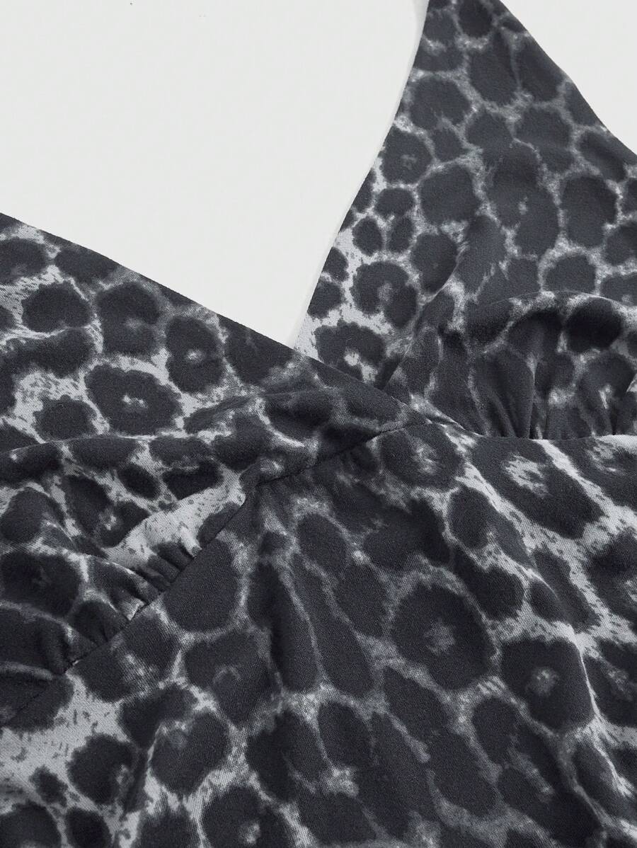 Grunge Punk Sexy Lady Banquet Leopard Print Ruched Tiered Hem Halter Dress