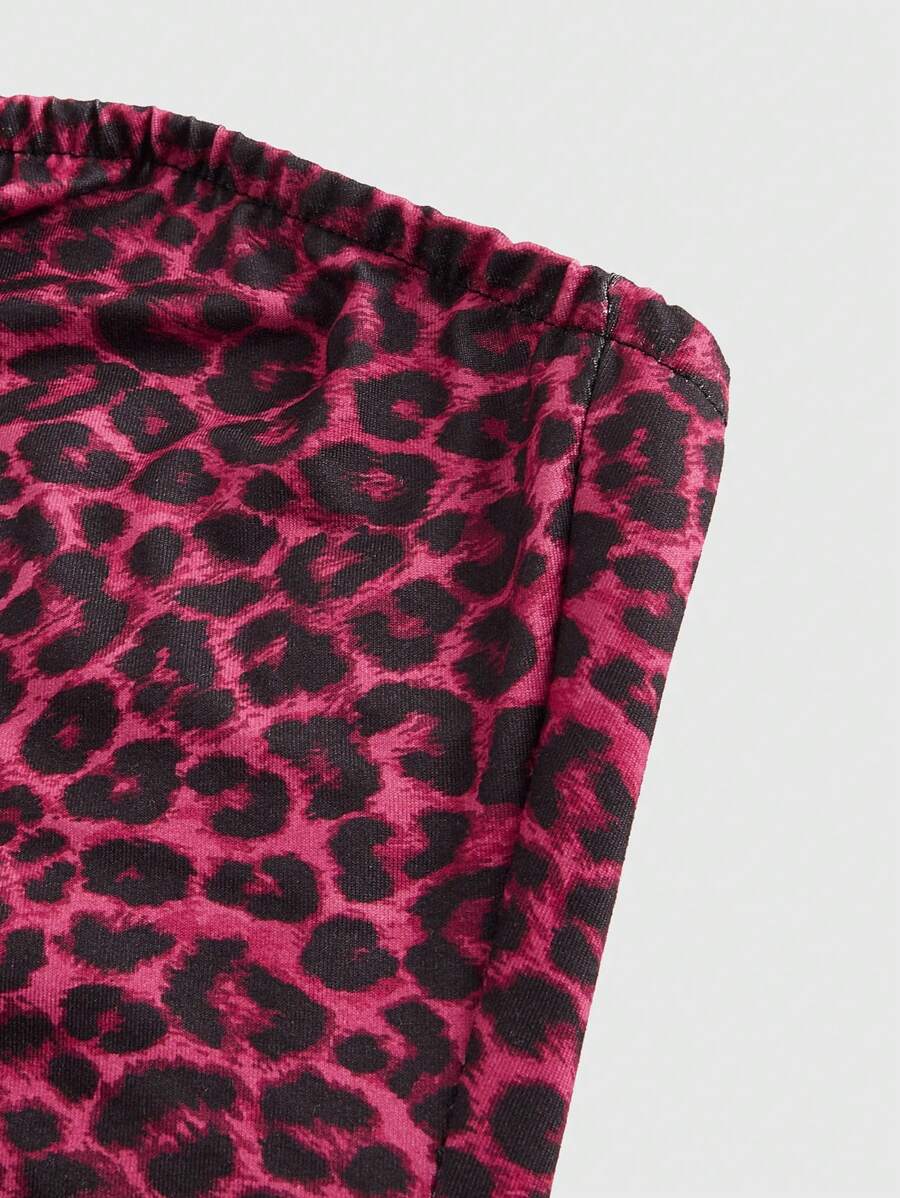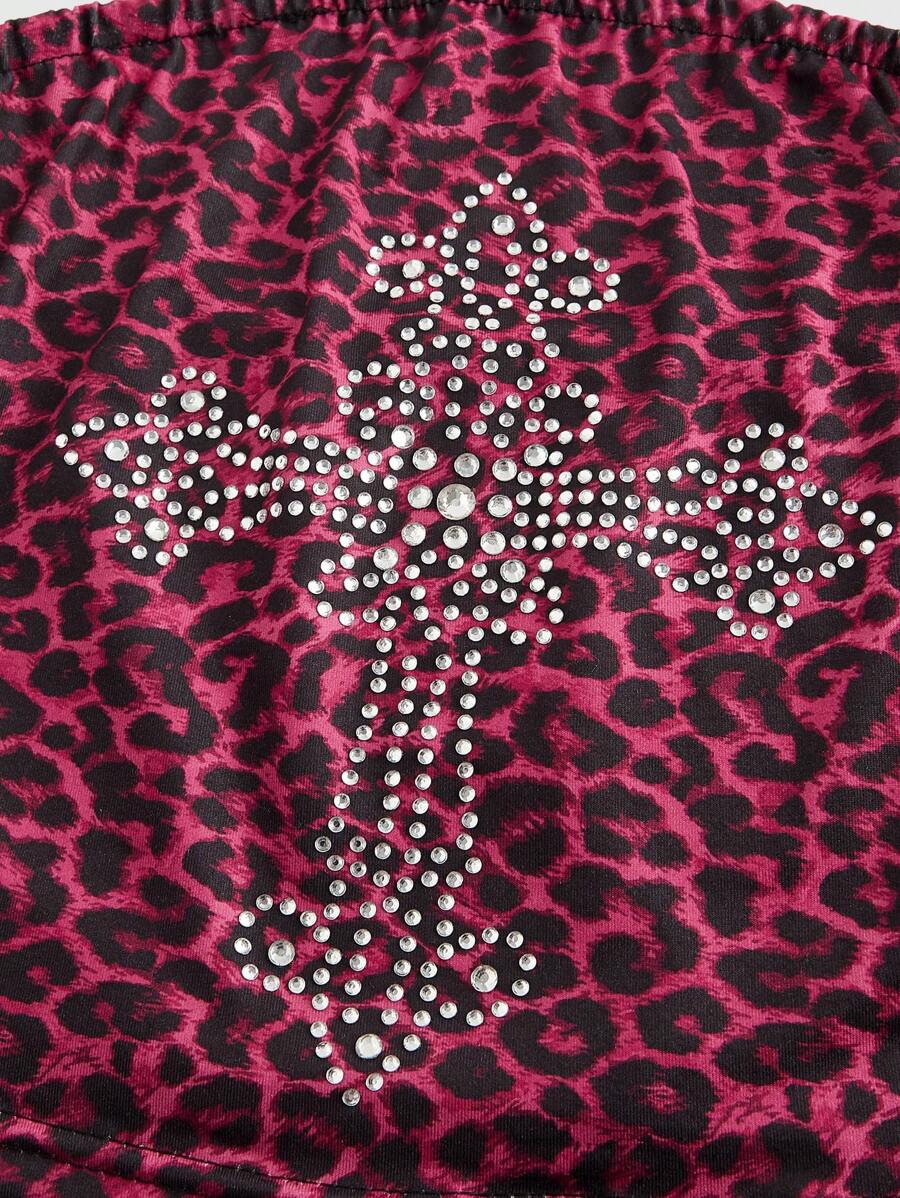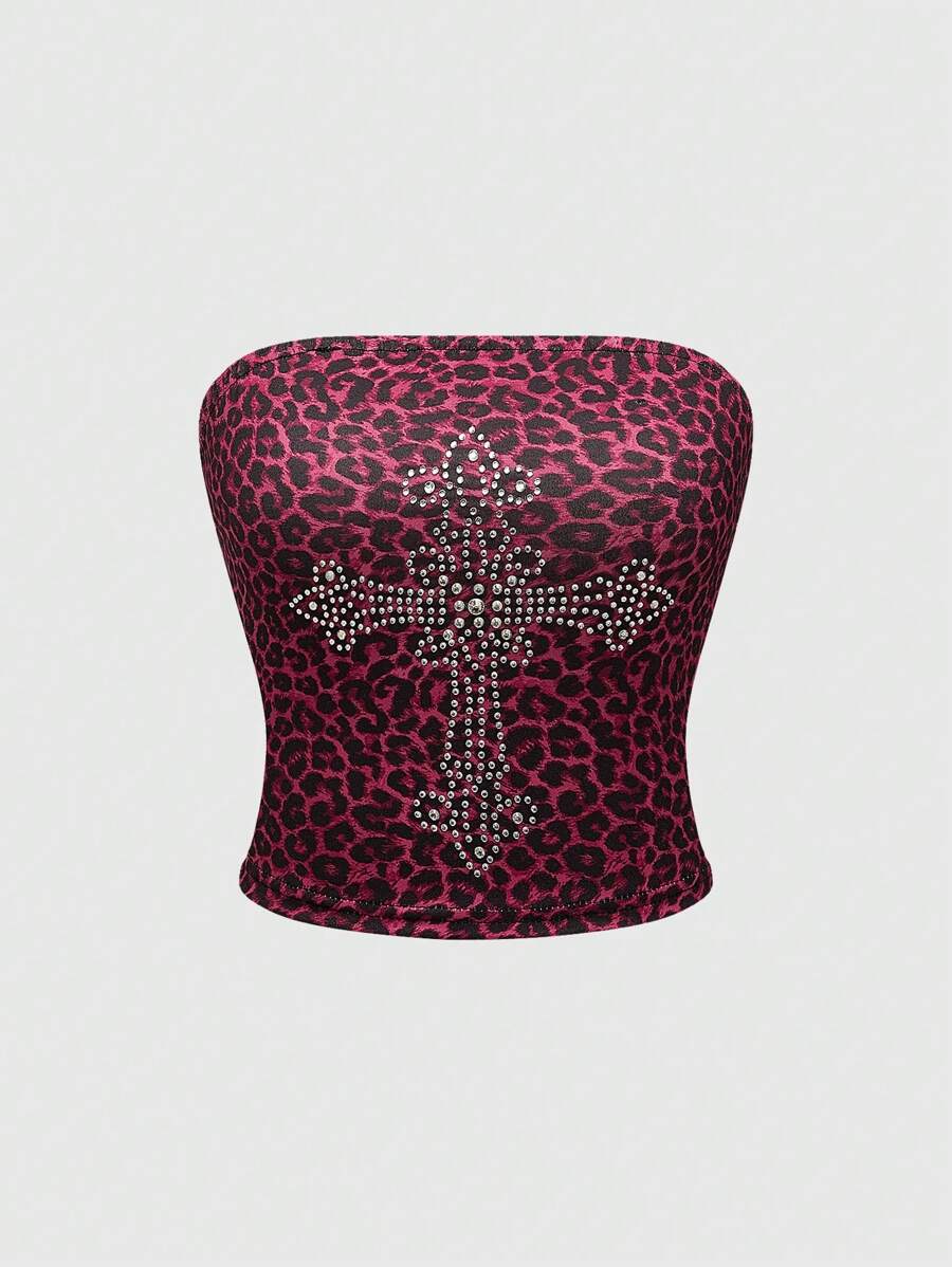Grunge Punk Sexy Leopard Print Strapless Top With Cross & Rhinestone Decoration For Women, Stretchy, School, For Carnival