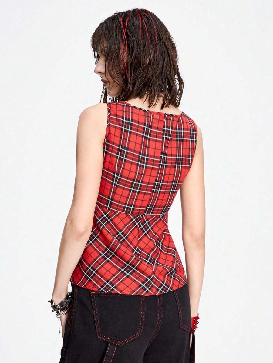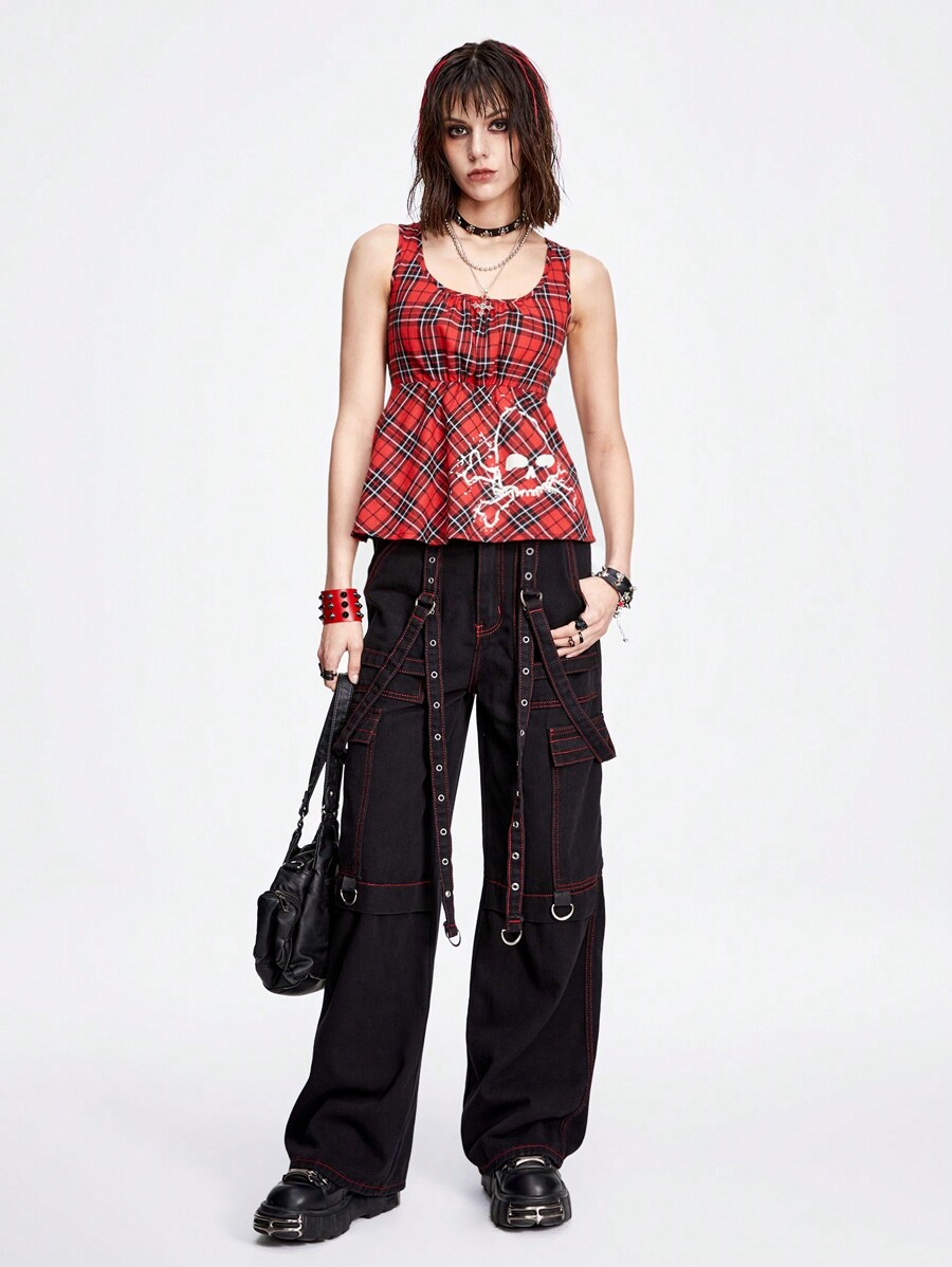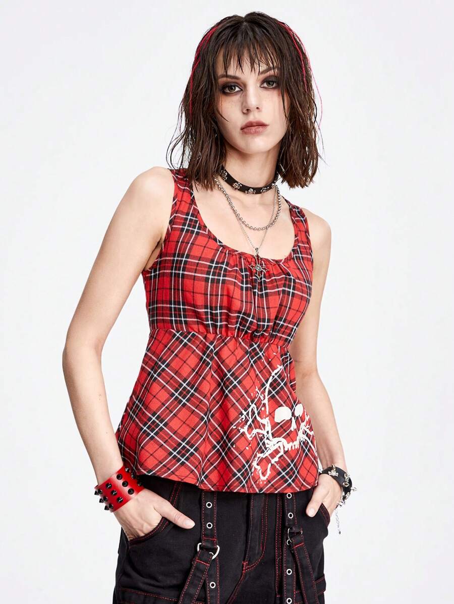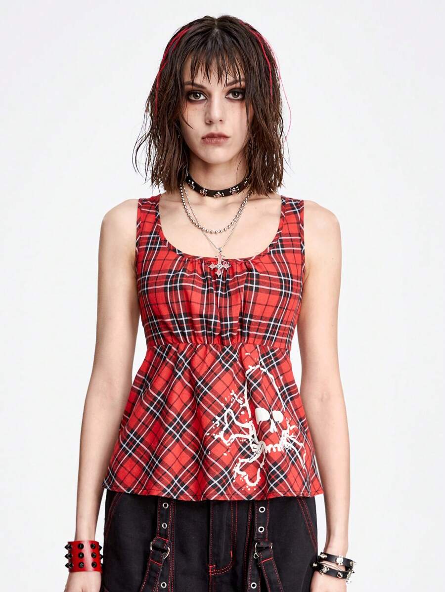 Grunge Punk Sexy & Sweet Skull Printed Slim Fit Tank Top With Square Neckline And Pleated Plaid Pattern For Women