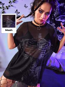 Grunge Punk Skeleton Graphic Mesh Top, School