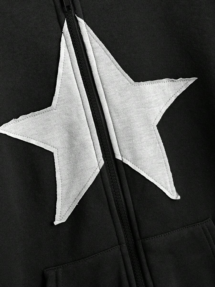 Grunge Punk Solid Color Zip Up Star Print Hooded Sweatshirt