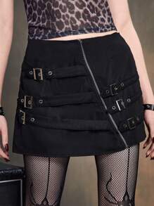 Grunge Punk Solid Zip Up Grommet Eyelet Skirt