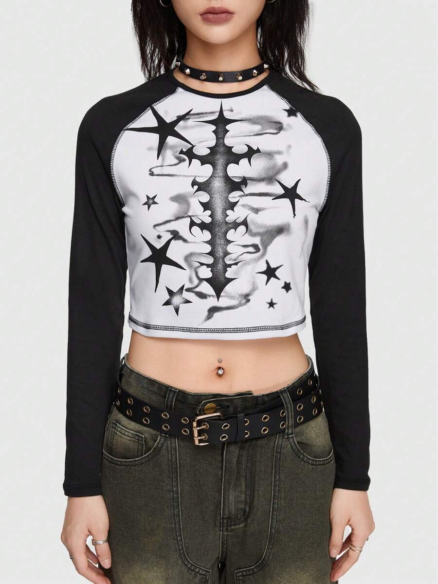 Grunge Punk Star Print Raglan Sleeve Crop Tee