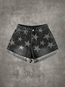Grunge Punk Star Print Roll Up Hem Denim Shorts