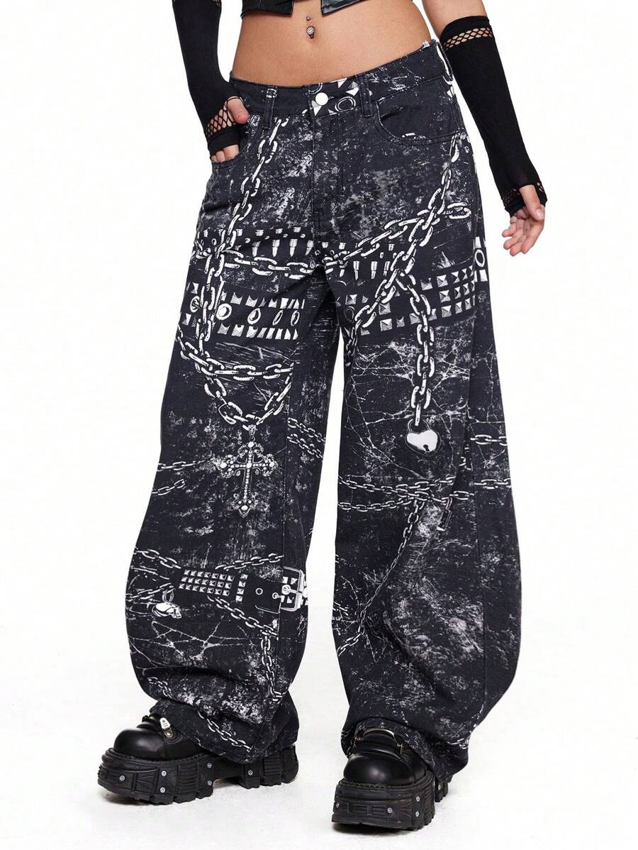 Grunge Punk Street Stylish Chain Print Loose Low-Waist Wide Leg Jeans, Unisex