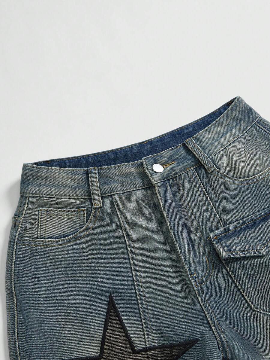 Grunge Punk Unisex Punk Street Style Star Applique Front Pockets Distressed Faded Bermuda Wide Leg Denim Shorts