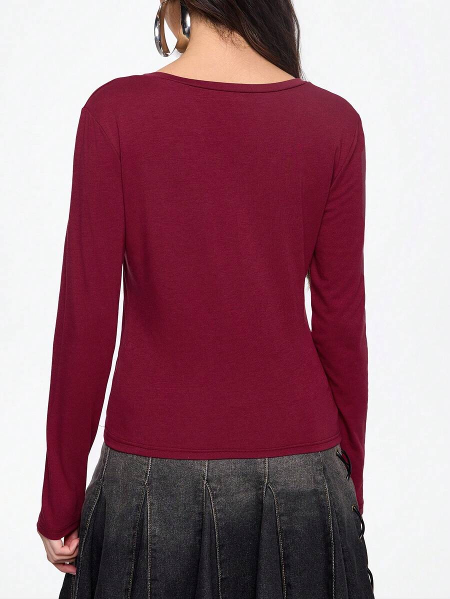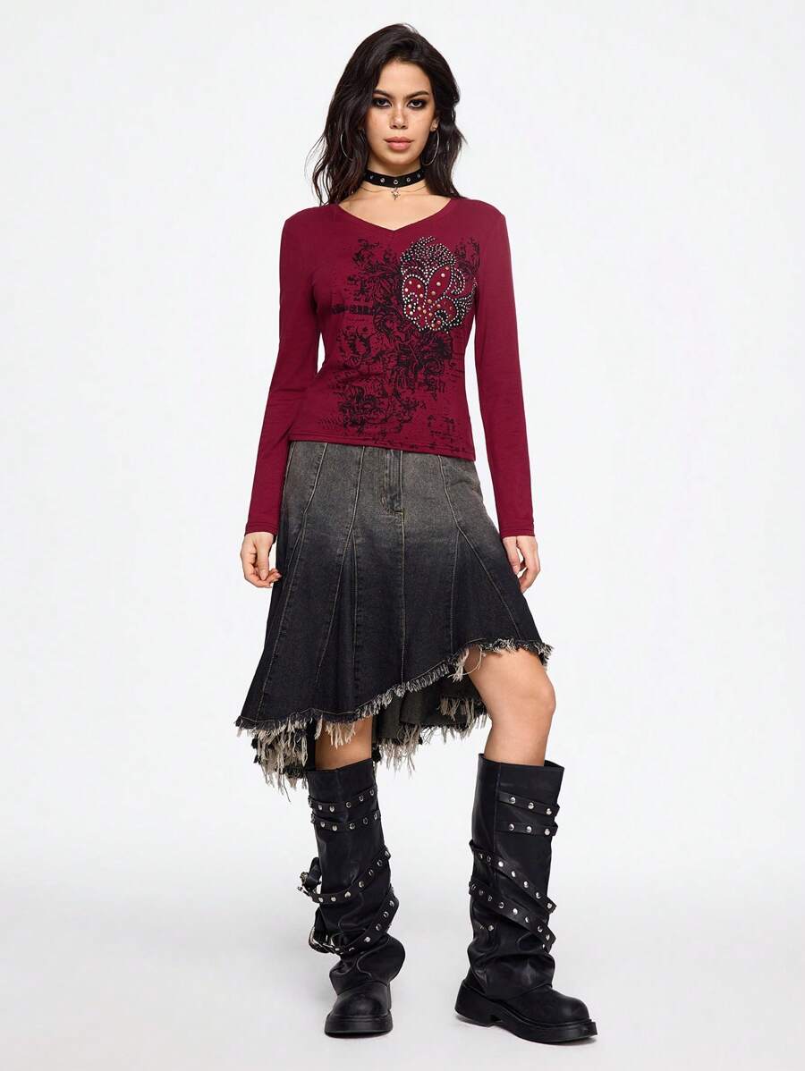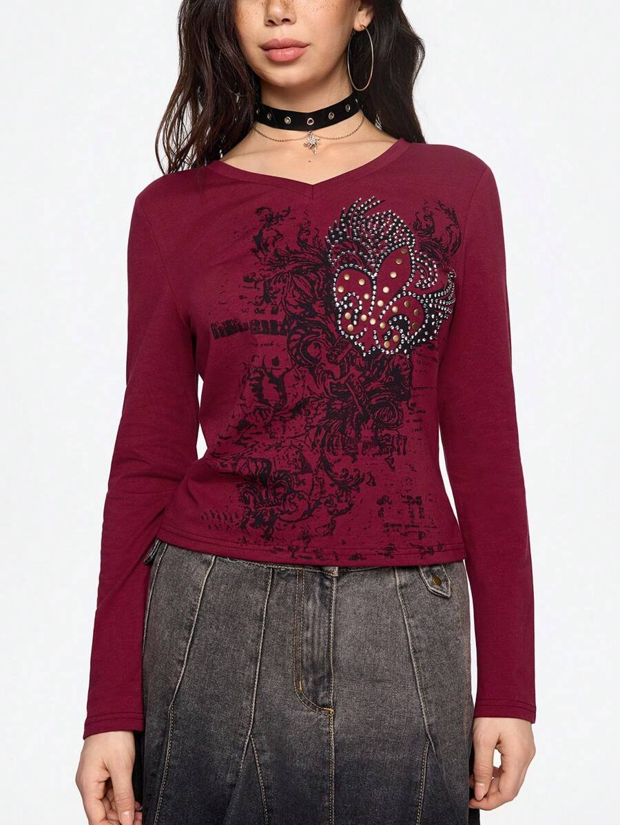 Grunge Punk Valentine's Day Casual Punk V-Neck Wing Rhinestone Print Women Long Sleeve T-Shirt
