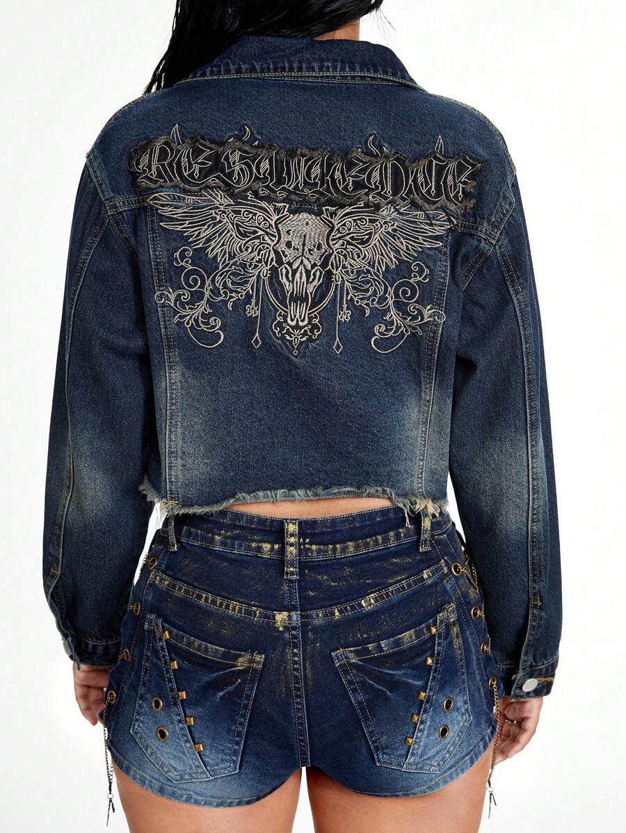 Grunge Punk Vintage Distressed PUNK Skeleton Wing Embroidery Denim Jacket