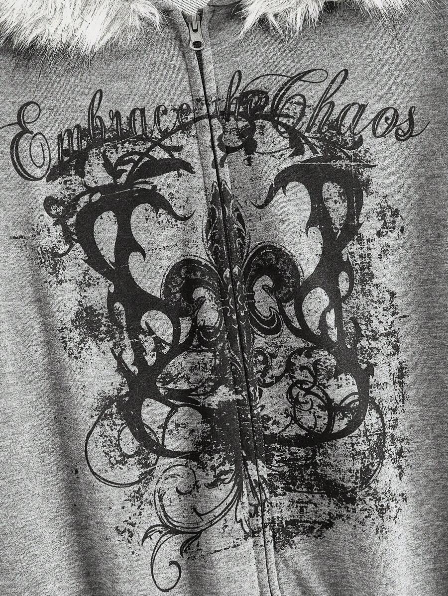 Grunge Punk Vintage Gothic Punk Vine Print Hooded Sweatshirt With Fluffy Collar, Loose Fit Long Sleeve Women Sweatshirt