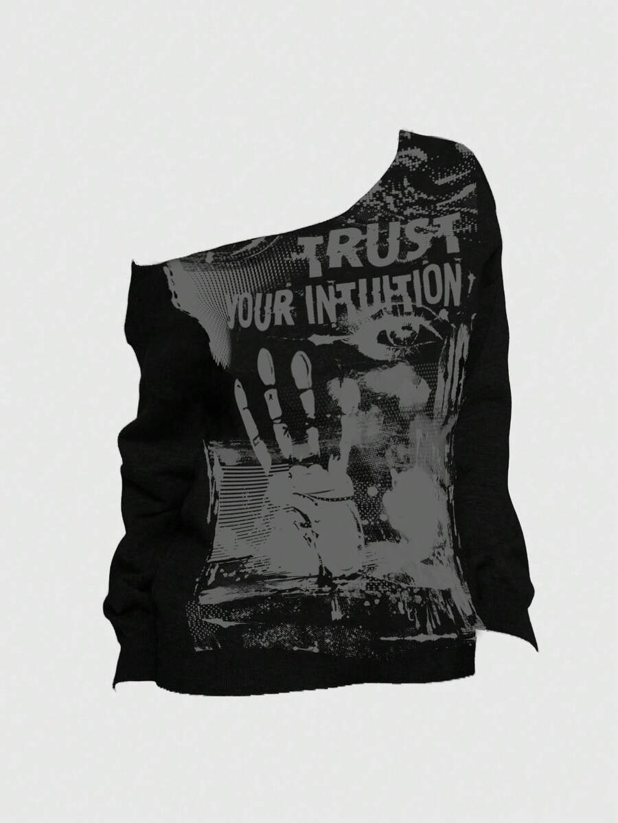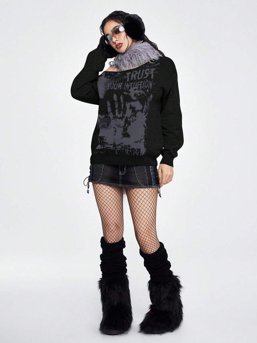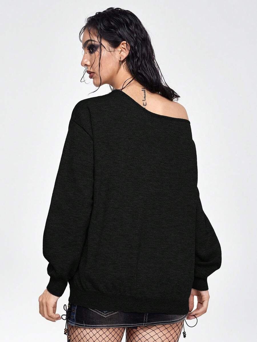 Grunge Punk Vintage Music Festival Party Skeleton Tie-Dye Print Loose Asymmetrical Shoulder Women Kpop Sweater