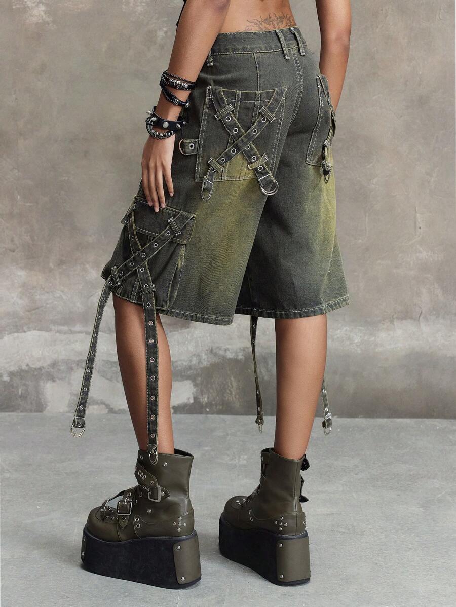 Grunge Punk Vintage Washed Denim Mid-Thigh Cargo Shorts With Multi-Pockets, Loose Relaxed Waist, Dystopian Punk Street Style