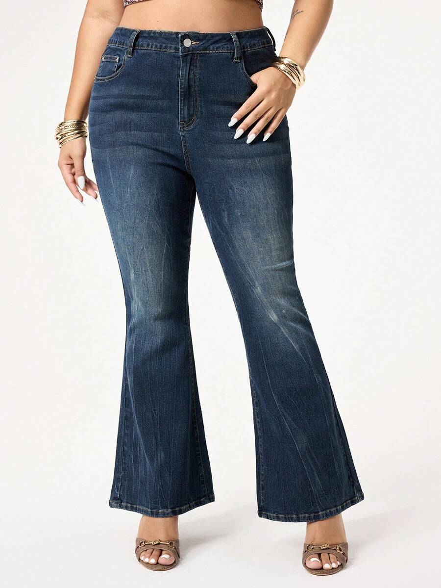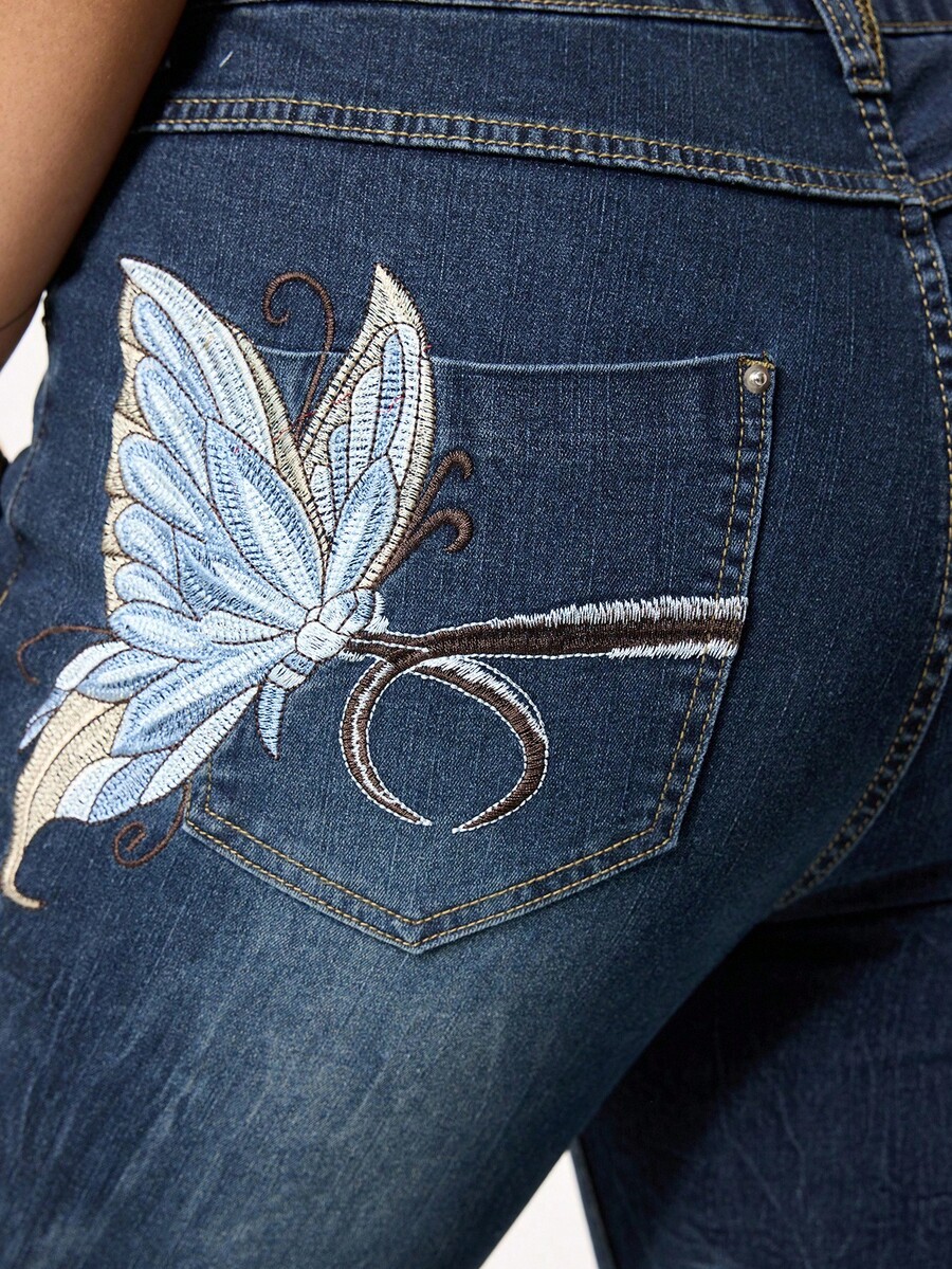 Grunge Punk Vintage-Washed Floral Embroidery Bell-Bottom Plus Size Jeans, Casual Retro Boho Style