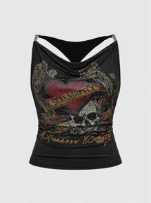 Grunge Punk Vintage Y2K Skull Wing Heart Rhinestone Decor Drop Shoulder Plus Size Women Camisole
