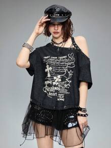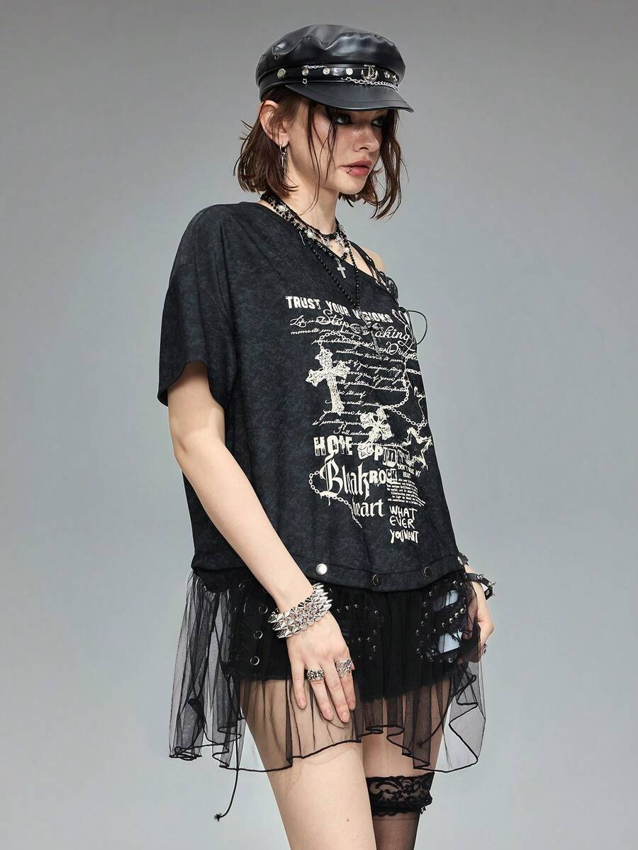 Grunge Punk Vintage Y2K Streetwear Metal Strap Decor Oblique Shoulder Graffiti Cross & Letter Print Mesh Patchwork Loose T-Shirt For Women, Removable Mesh