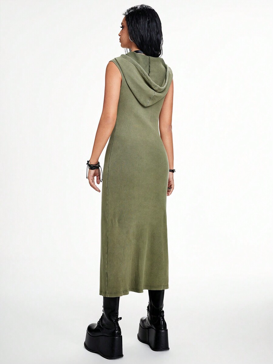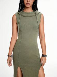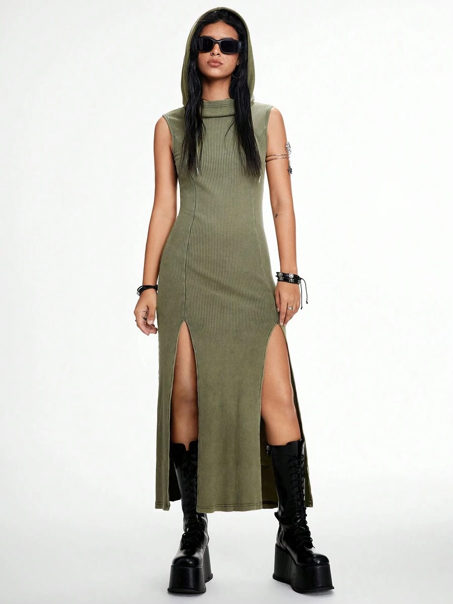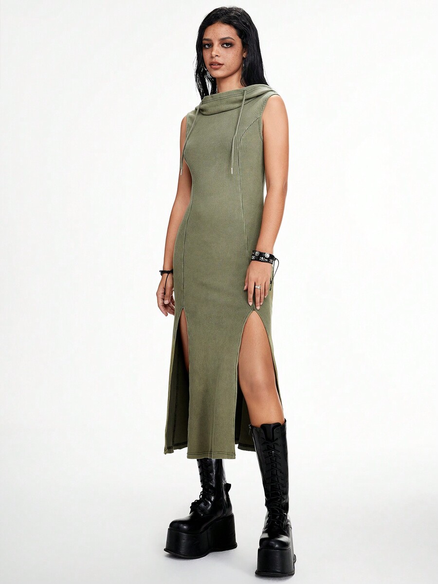 Grunge Punk Wasteland Dune Style High Slit Women's Hooded Sleeveless Bodycon Dress, Grayish Green