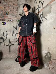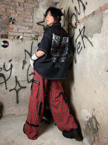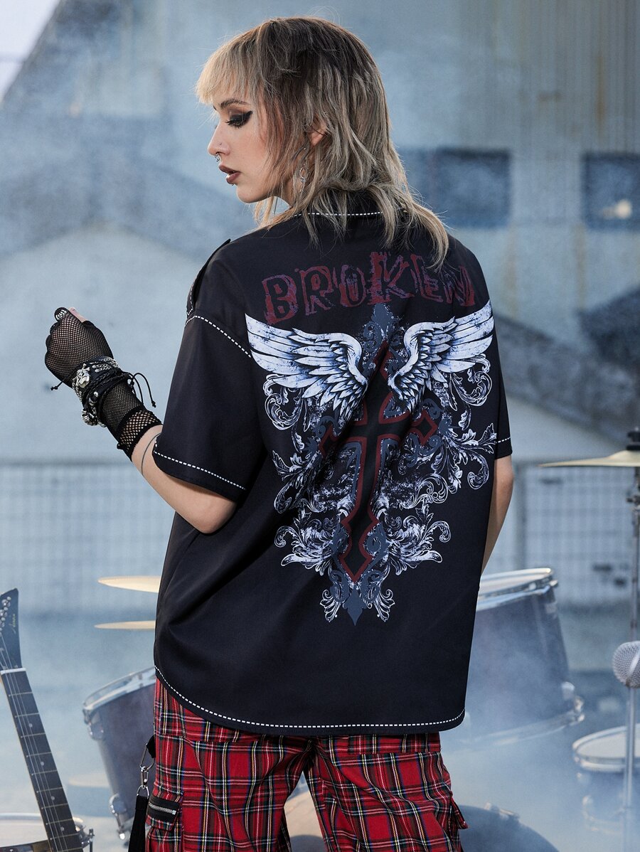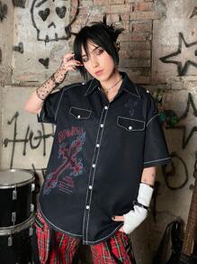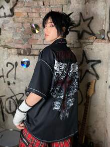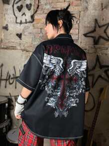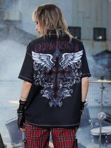 Grunge Punk Wings & Letter Graphic Top-stitching Drop Shoulder Shirt