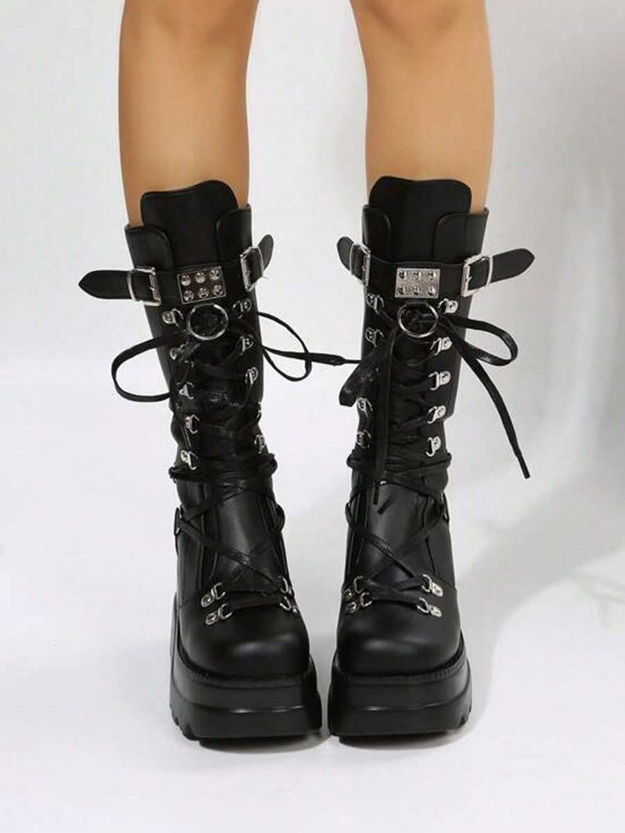 Grunge Punk Women Buckle Decor Lace-up Front Wedge Boots, Punk Outdoor Fashion Boots