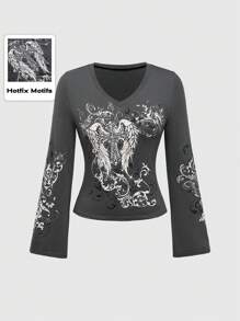 Grunge Punk Women Cross & Wing Print V-Neck Flare Sleeve T-Shirt