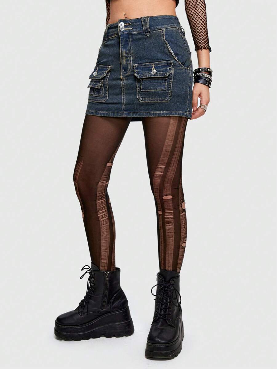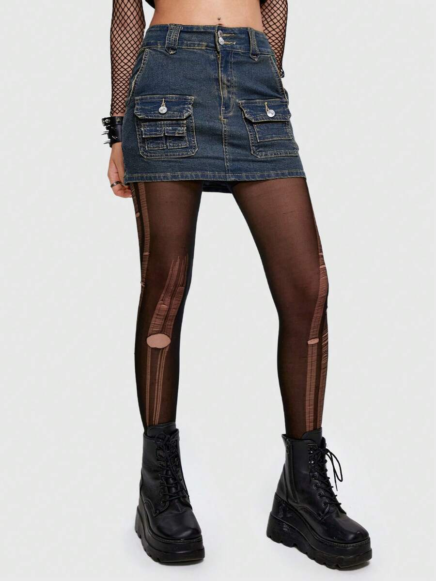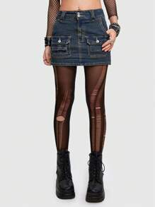 Grunge Punk Solid Denim Skirt With Straps