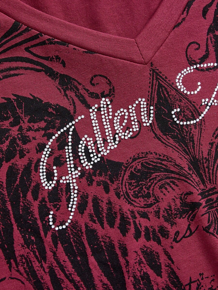 Grunge Punk Women Grunge Style Distressed Wing Print Rhinestone Embellished Fitted T-Shirt
