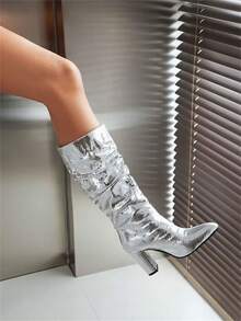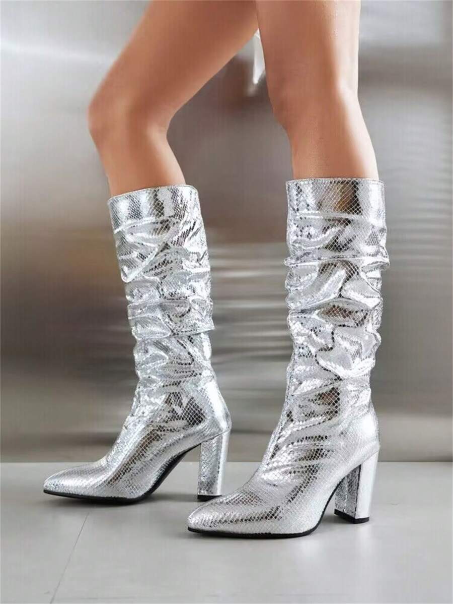 Grunge Punk Women Metallic Snakeskin Embossed Point Toe Chunky Heeled Slouchy Boots, Funky Outdoor Fashion Boots