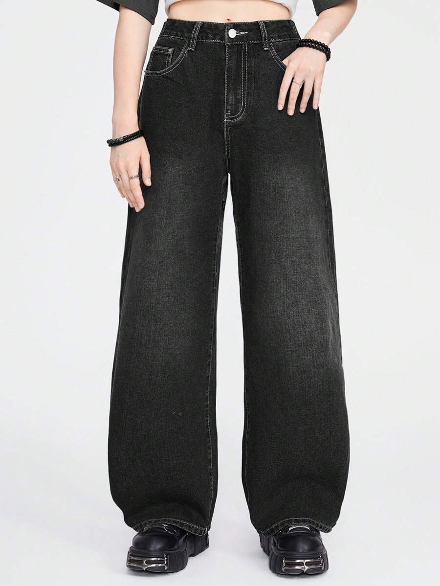 Grunge Punk Women's American Streetwear Hip-Hop Punk Style Wing & Cross Print Washed Low Waist Loose Wide Leg Jeans