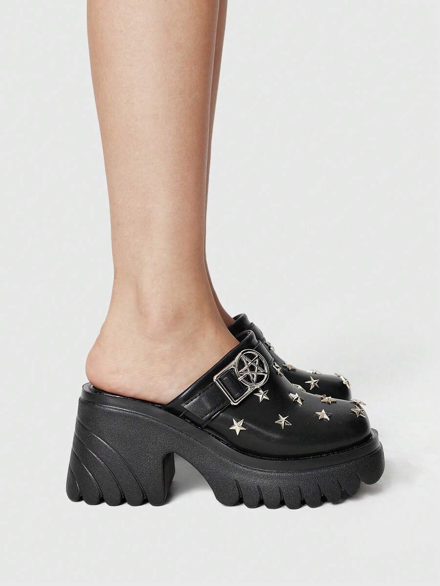 Grunge Punk Women's Black Gothic Punk Rock Shoes, Closed Toe Backless Mule Shoes With Star Metal Buckle, Closed Toe Thick Heel Platform Wedge Sandals Spring Shoes Spring Break Easter