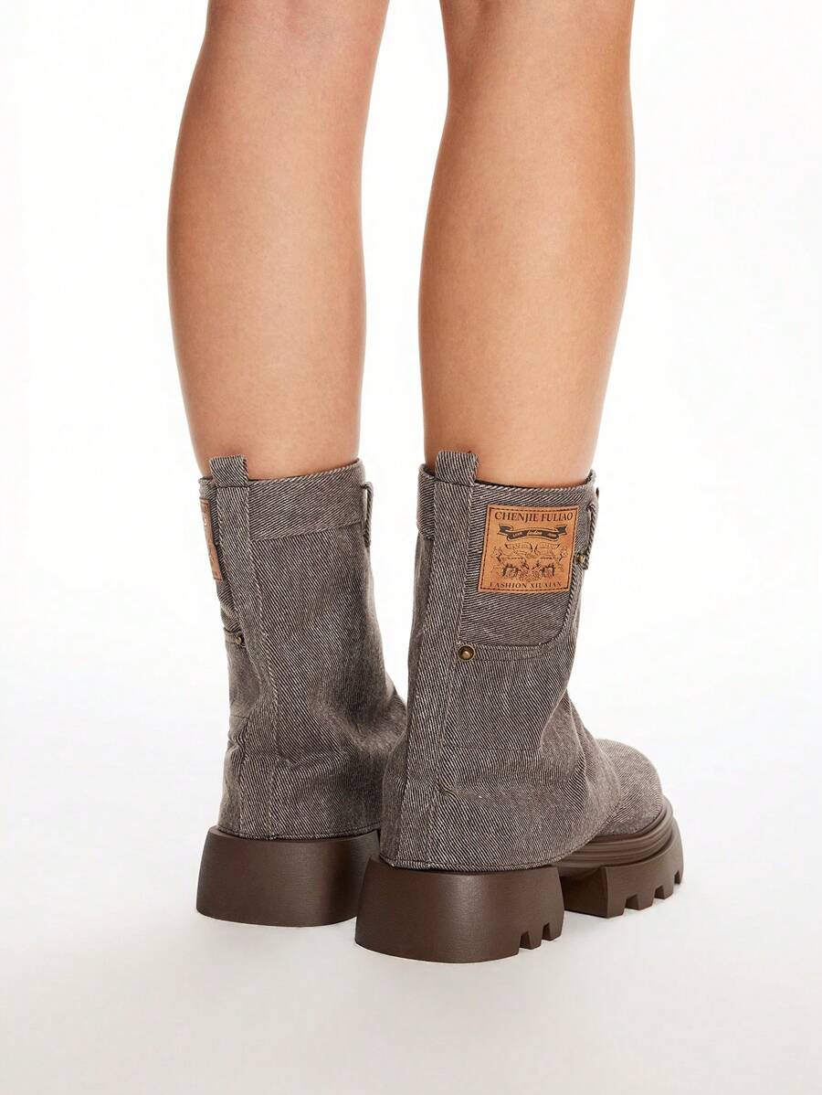 Grunge Punk Women's Bleach Spliced Round Toe Thick Bottom Flat Street Punk Brown Thick Bottom Short Boots, Daily Street Boots For Christmas And New Year Holiday Vibe Fall And Winter Valentines