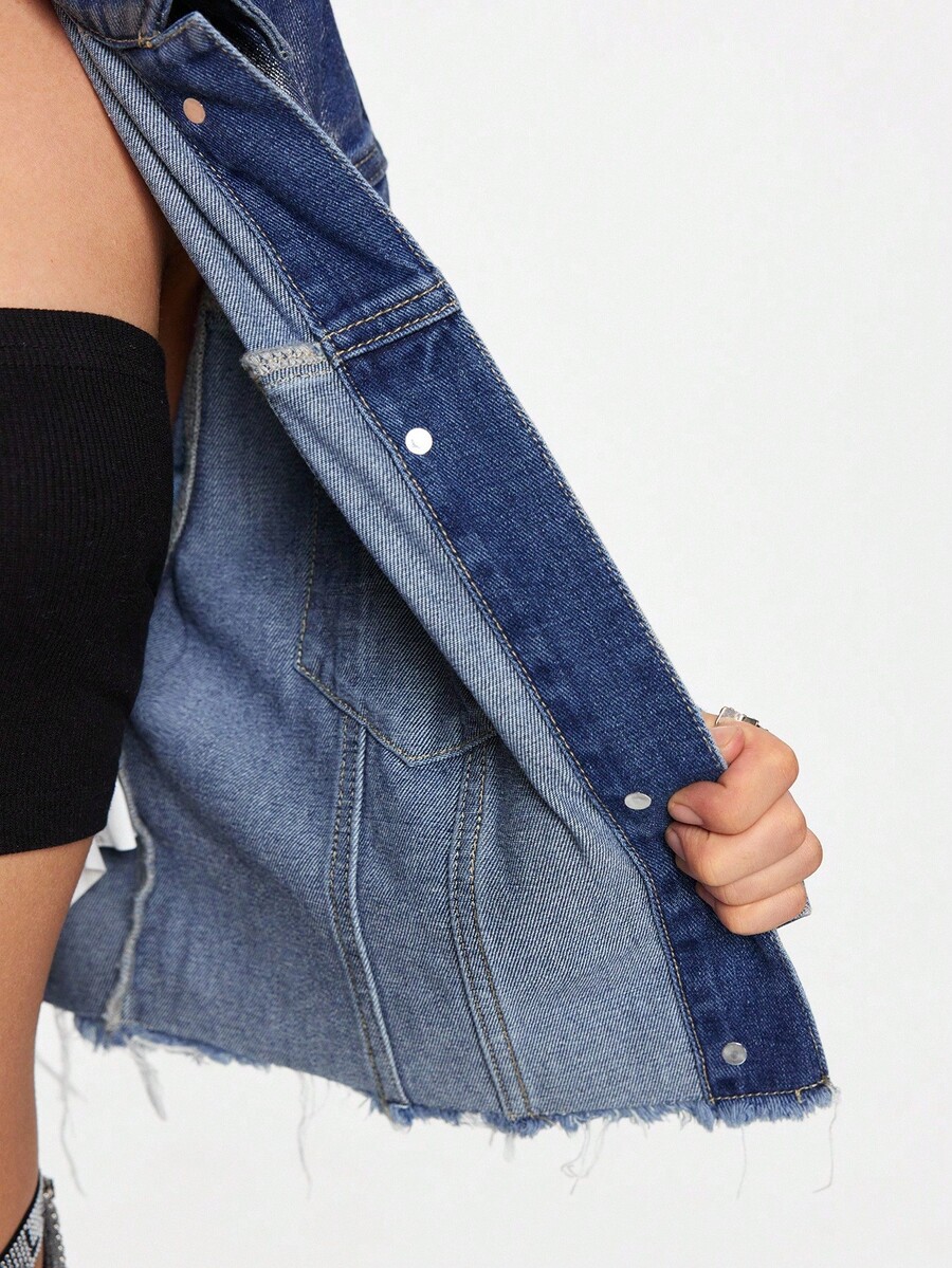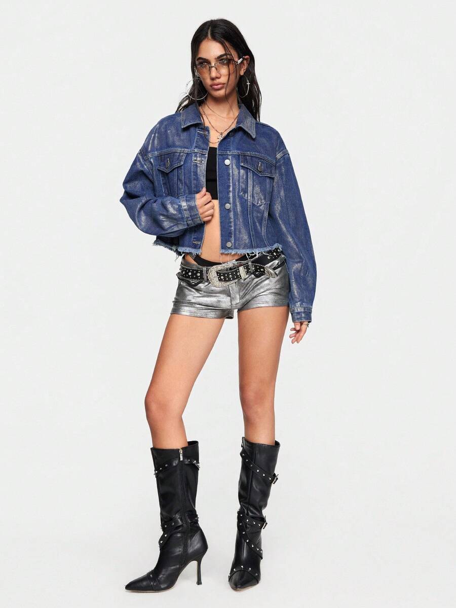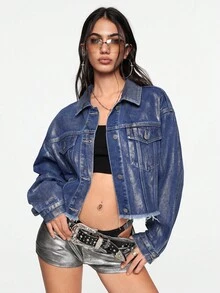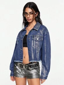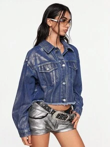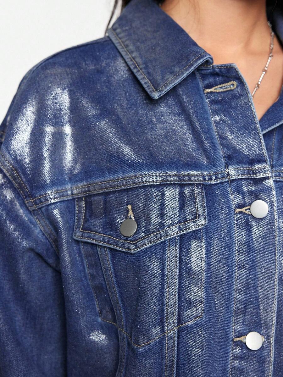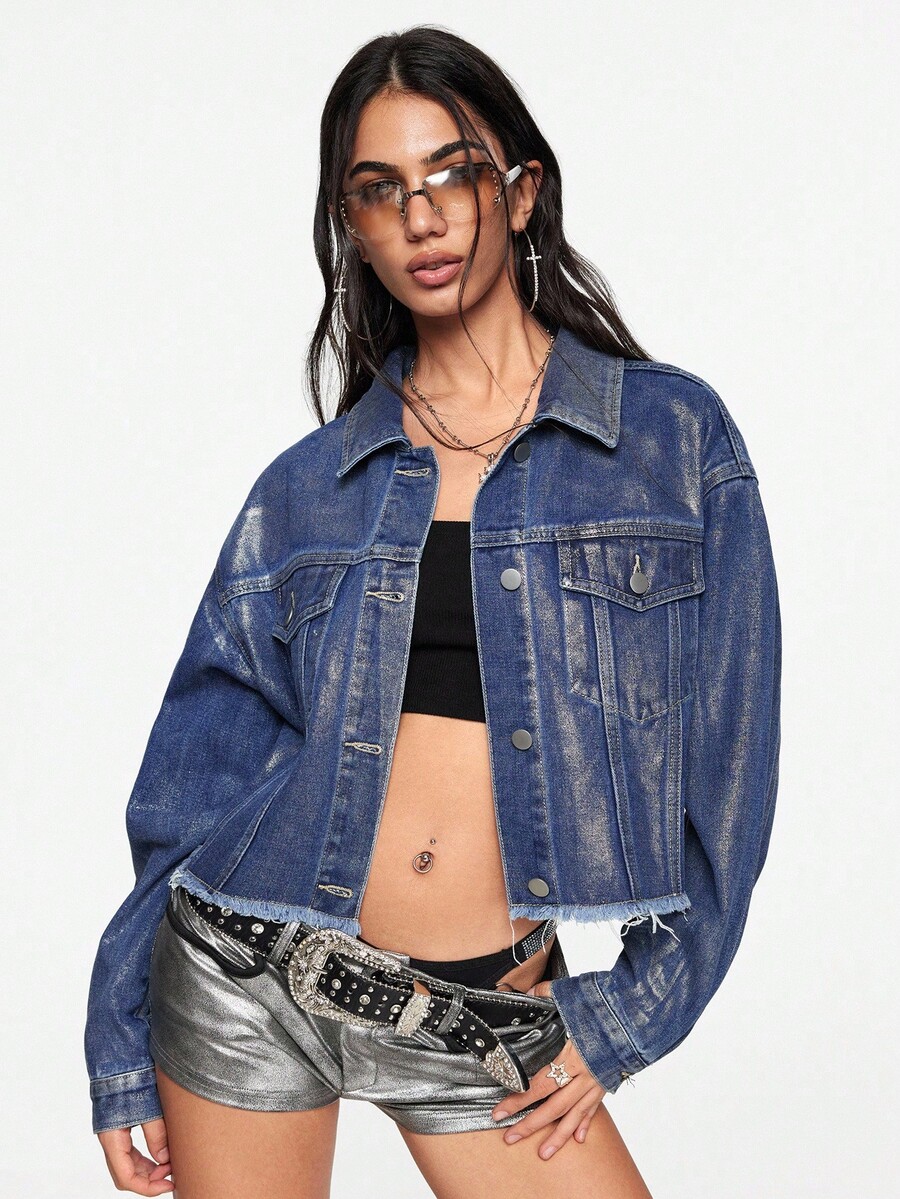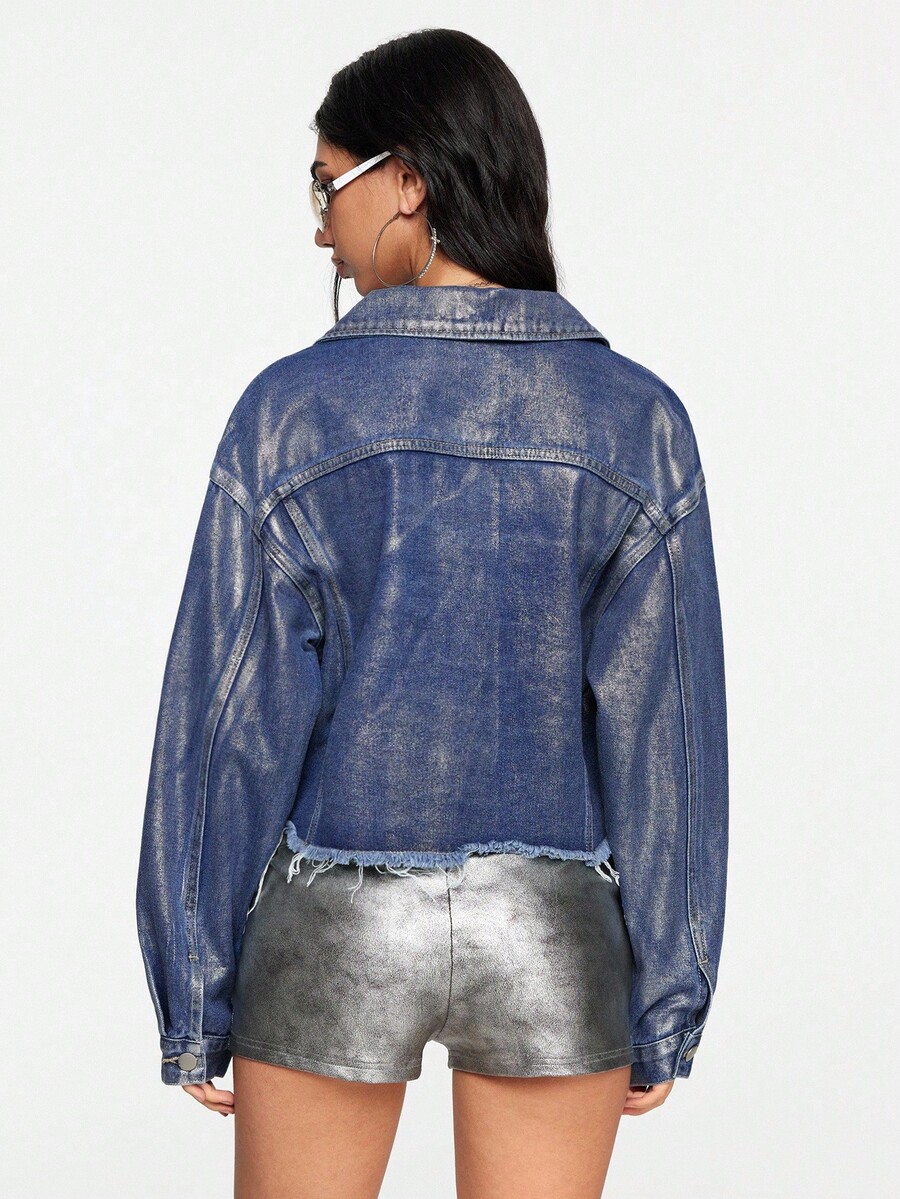 Grunge Punk Women's Casual Loose Fit Silver Foil Denim Jacket With Single-Breasted, Long Sleeve, Autumn