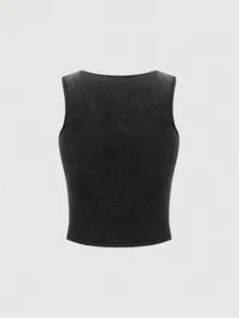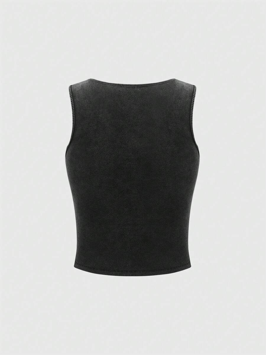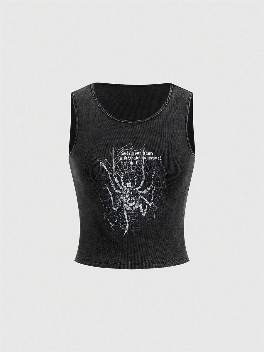 Grunge Punk Women's Cool Street Style Spider & Slogan Print Distressed Snow Wash Ribbed Tight Waist Camisole Top