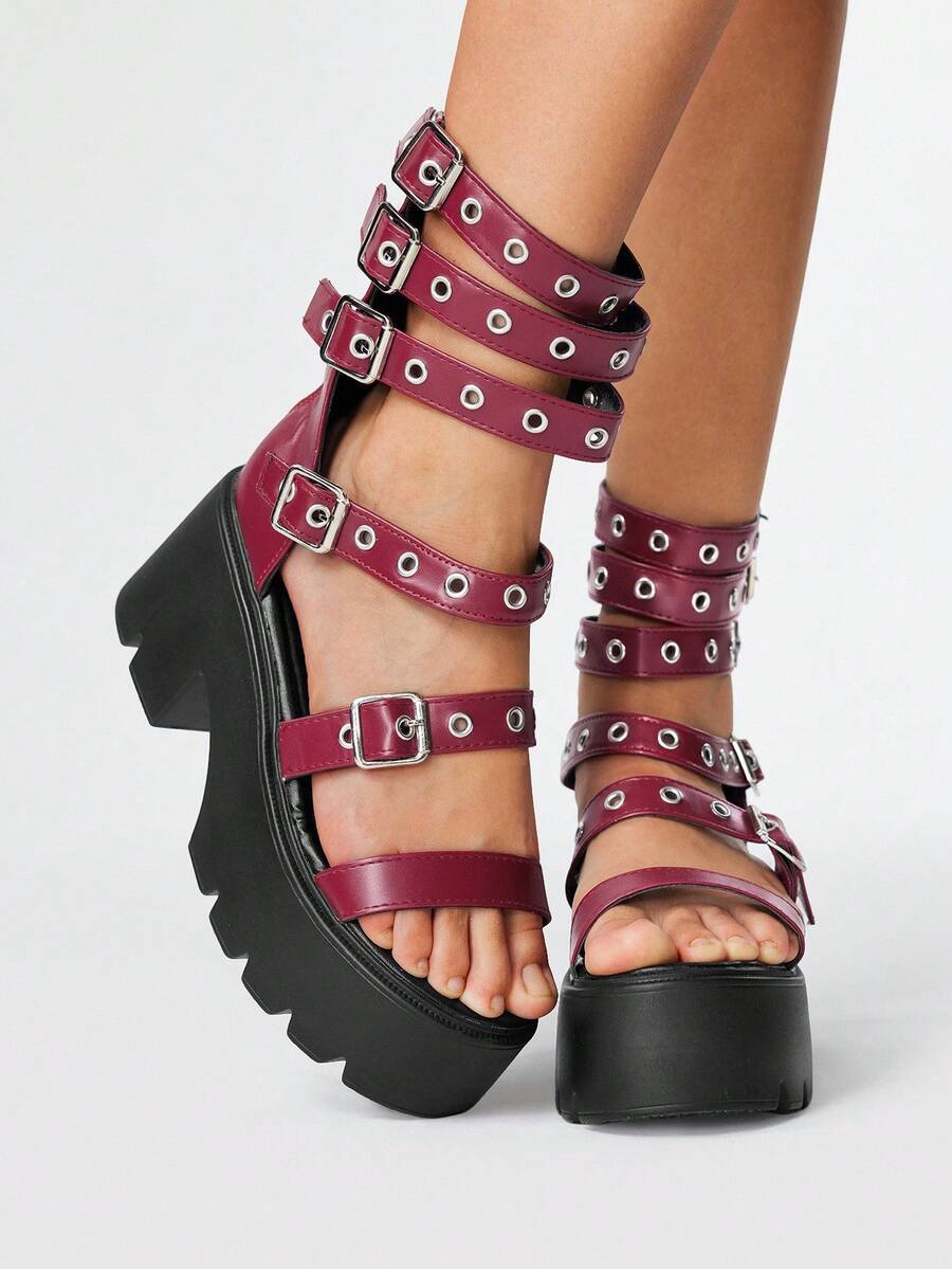 Grunge Punk Women's Dark Rock Punk Goth Shoes, Red Summer Open Toe Buckle Strap Roman Beach Sandals, Thick Heel Student Dress Shoes, Platform Wedge Sandals, Halloween