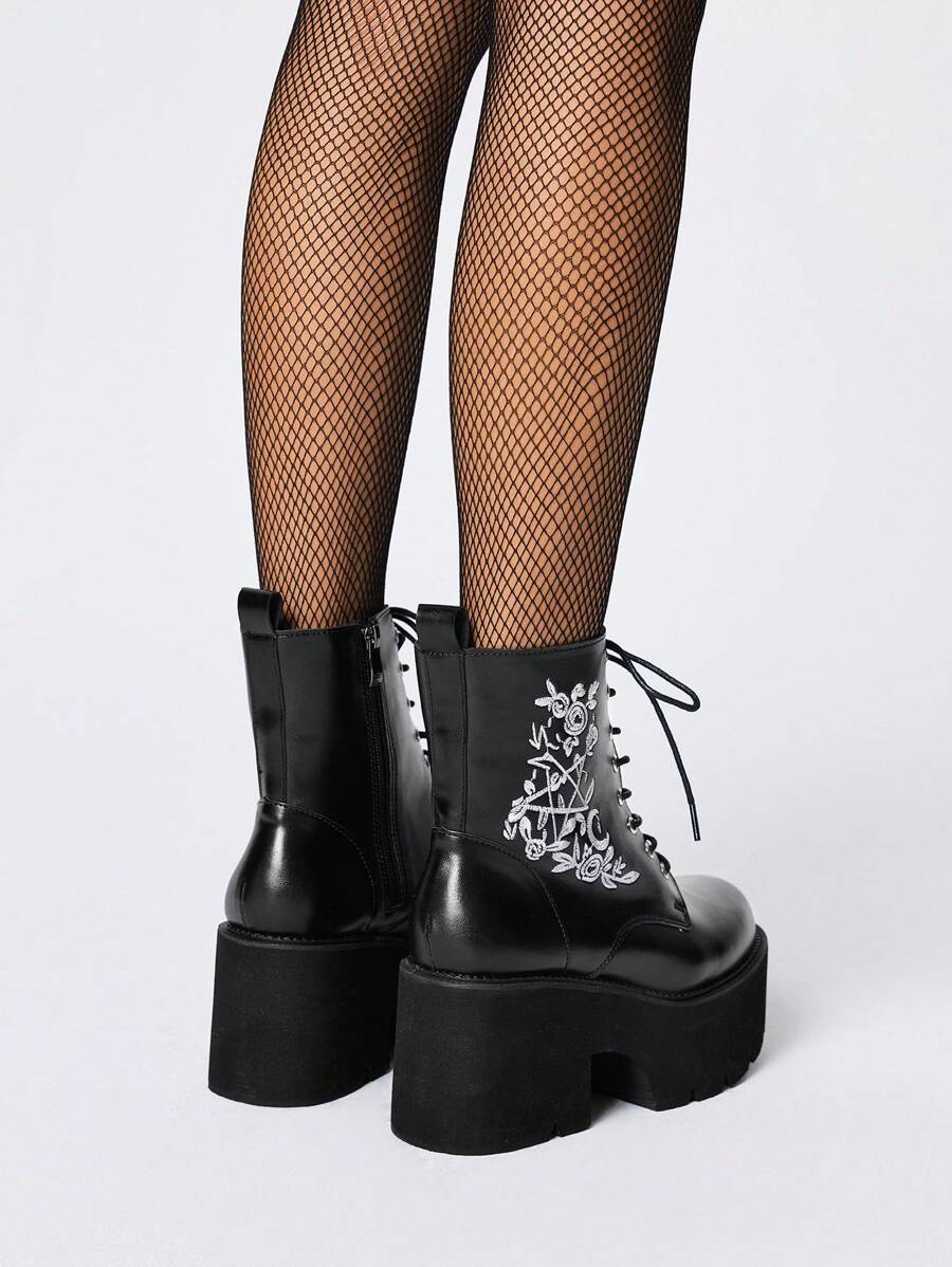 Grunge Punk Women's Fashion Lace Up Platform Ankle Boots, Gothic Style Floral Embroidery Side Zipper Combat Boots
