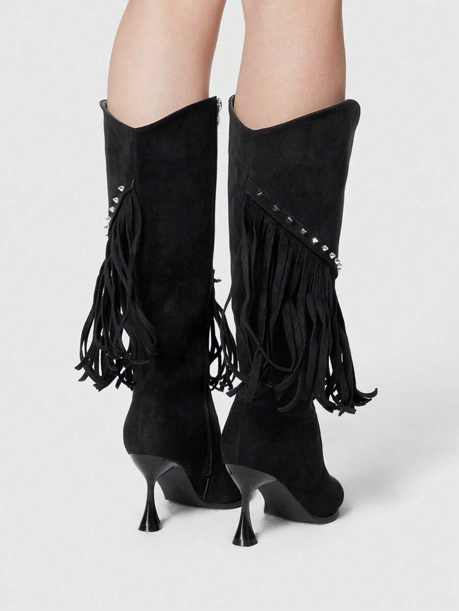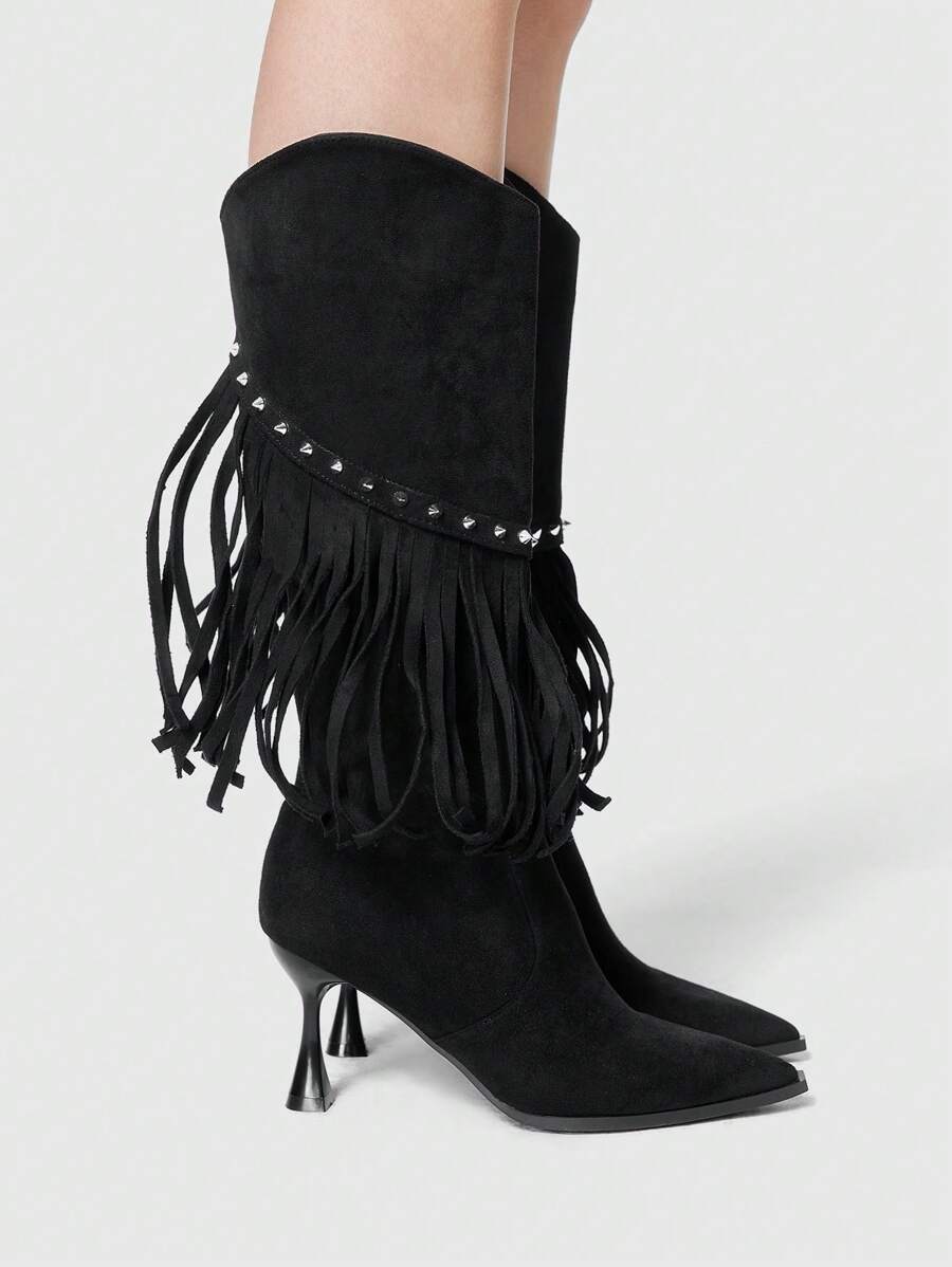 Grunge Punk Women's Fringe Pointed Toe Western Boots, High Heel Fashion Mid-Calf Cowboy Boots