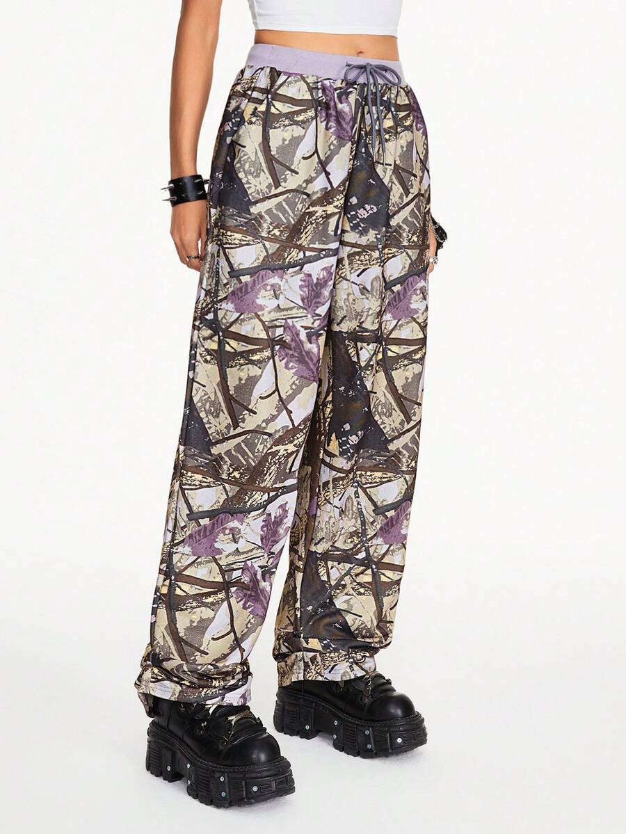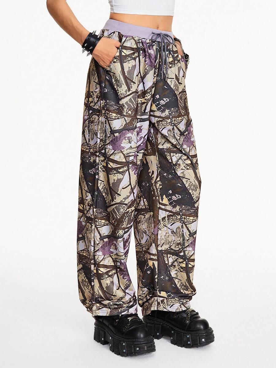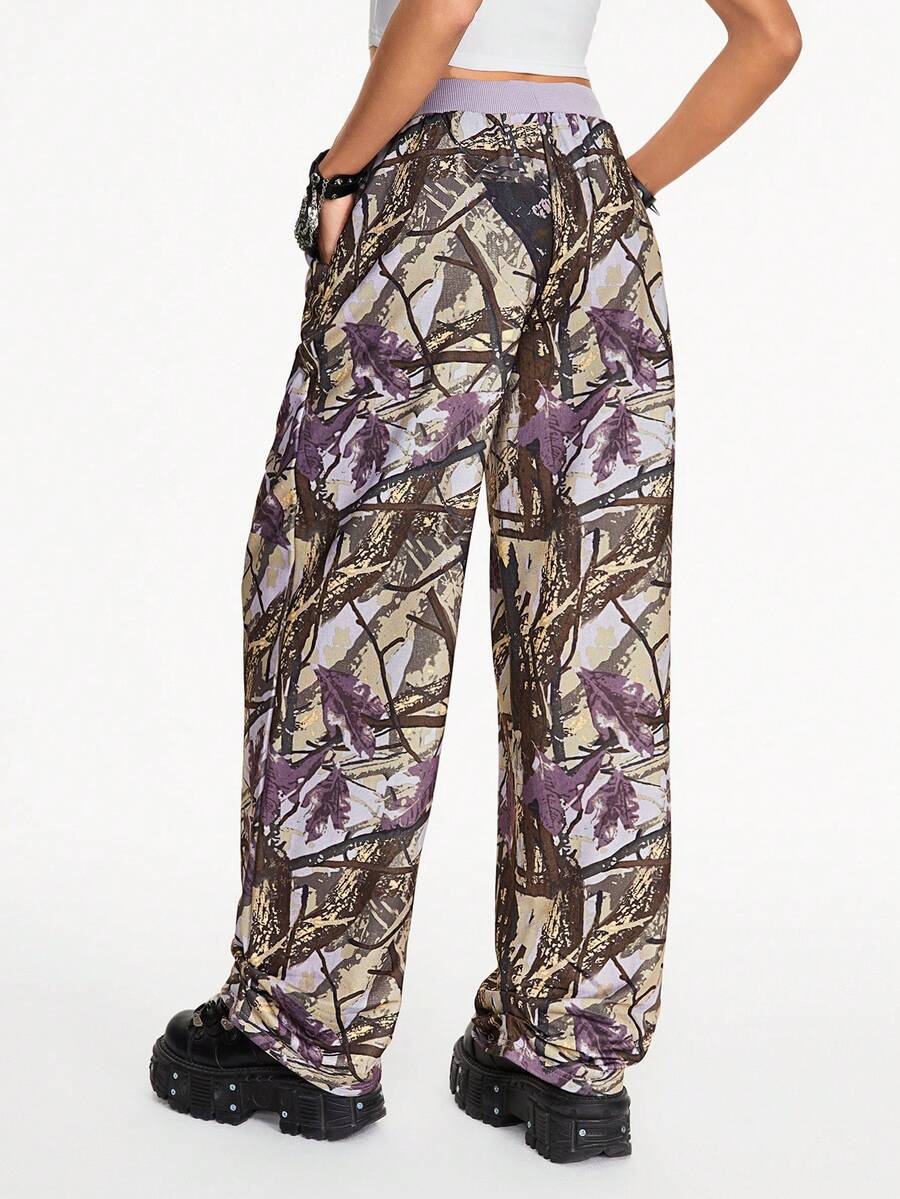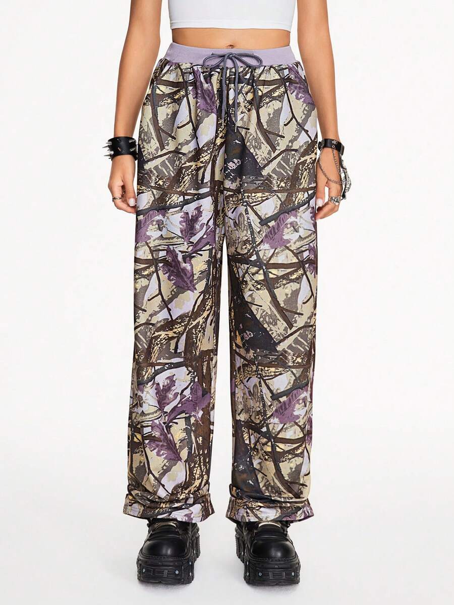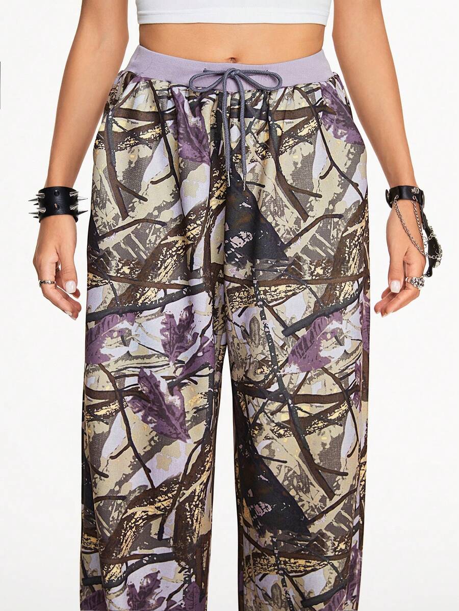 Grunge Punk Women's Loose Fit Camouflage Patchwork Sweatpants With Branch & Leaves Print, School