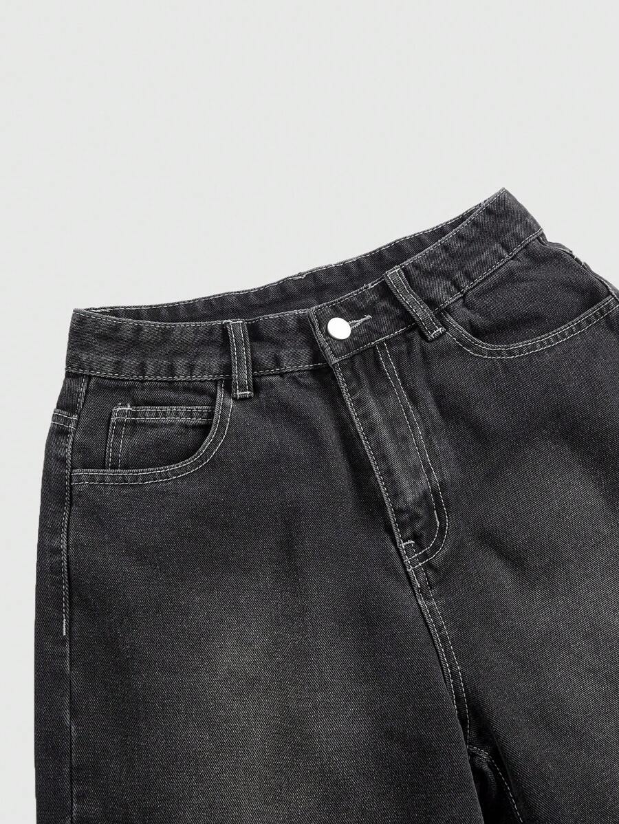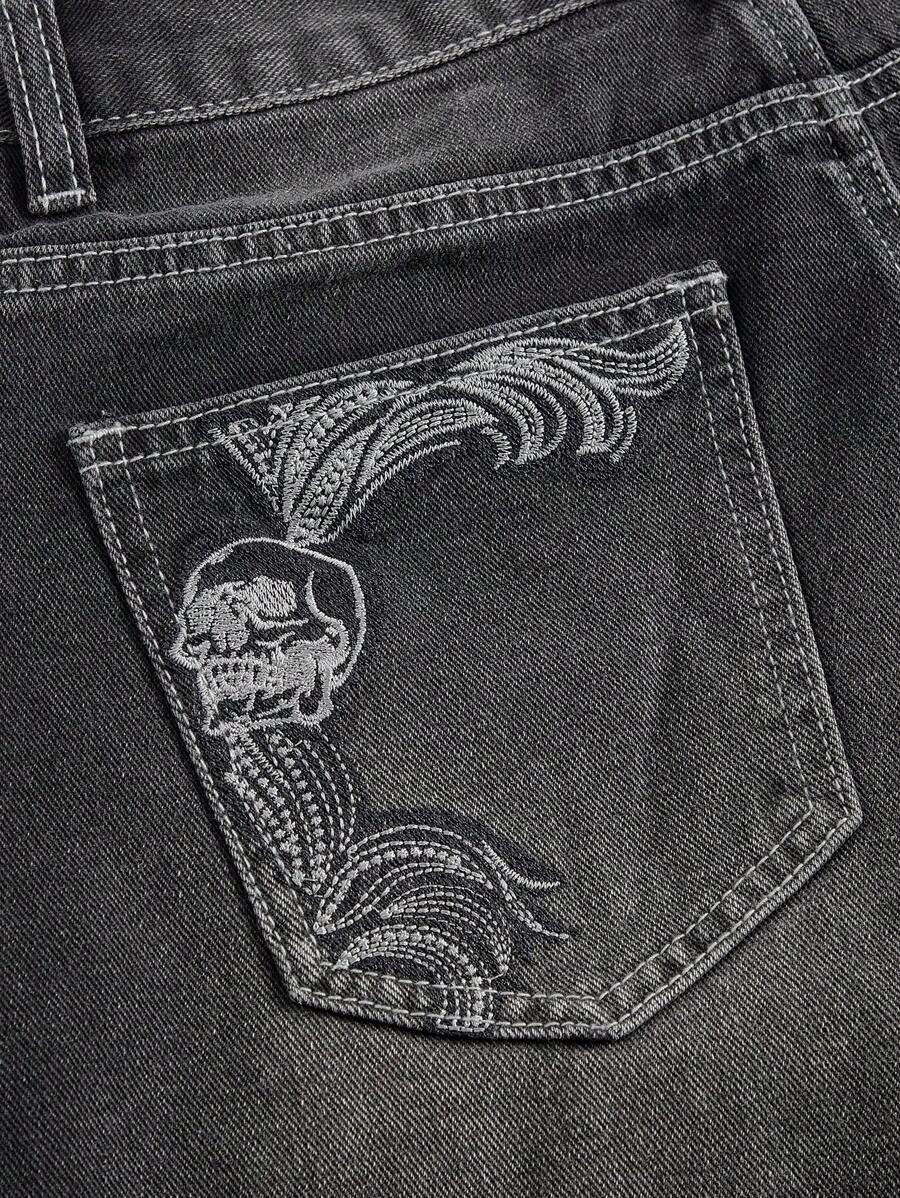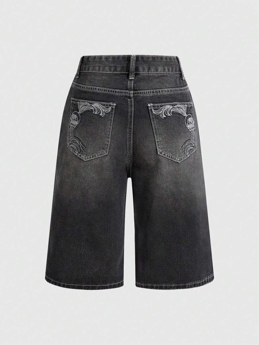 Grunge Punk Women's Loose-Fit Denim Shorts With Vintage Wash, Skull, Wing, Vine Embroidery Design, School
