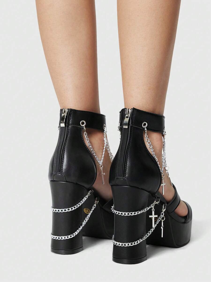 Grunge Punk Women's Metal Punk Cross Chain Thick Platform High Heel Sandals