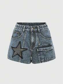 Grunge Punk Women's Punk Style Black Star Embroidery Gray Cargo Pocket Denim Shorts, Summer