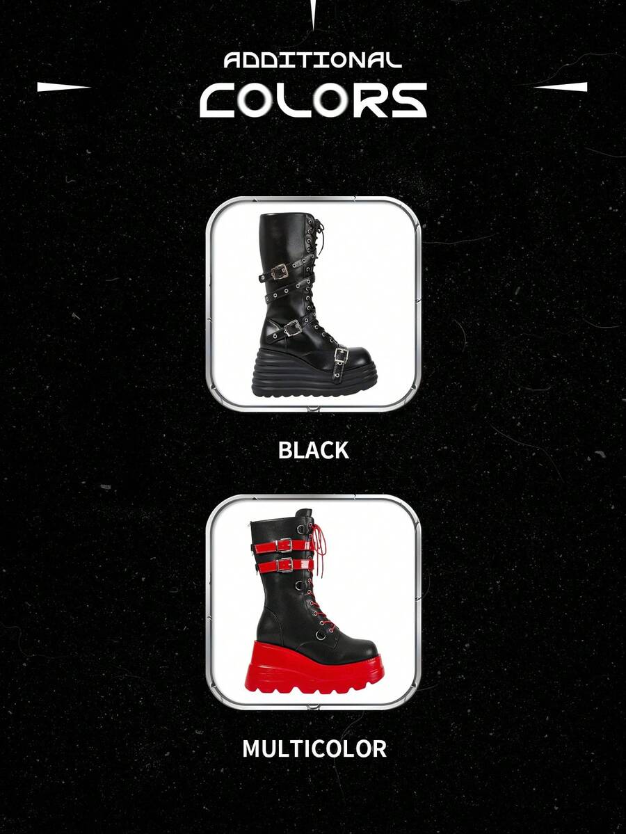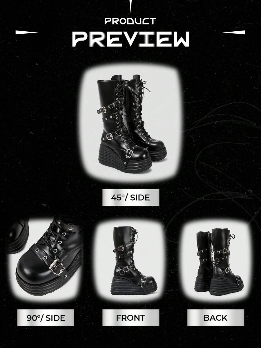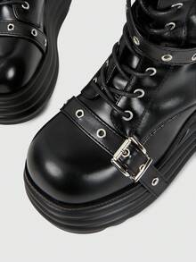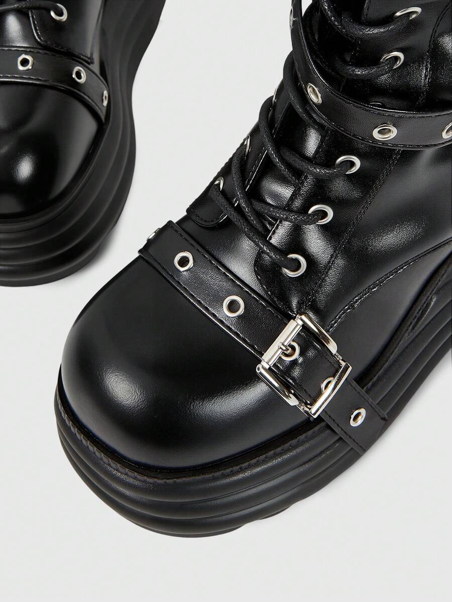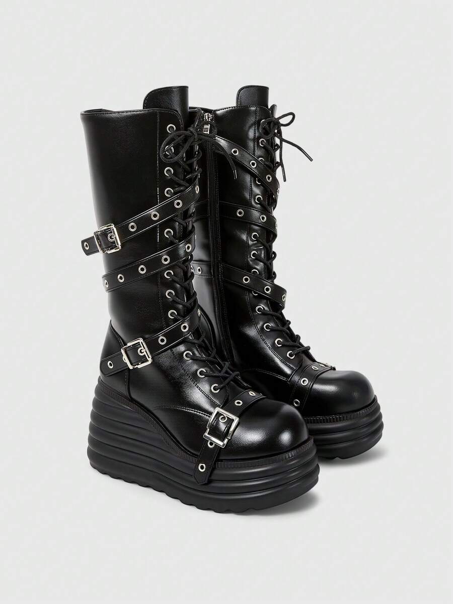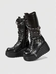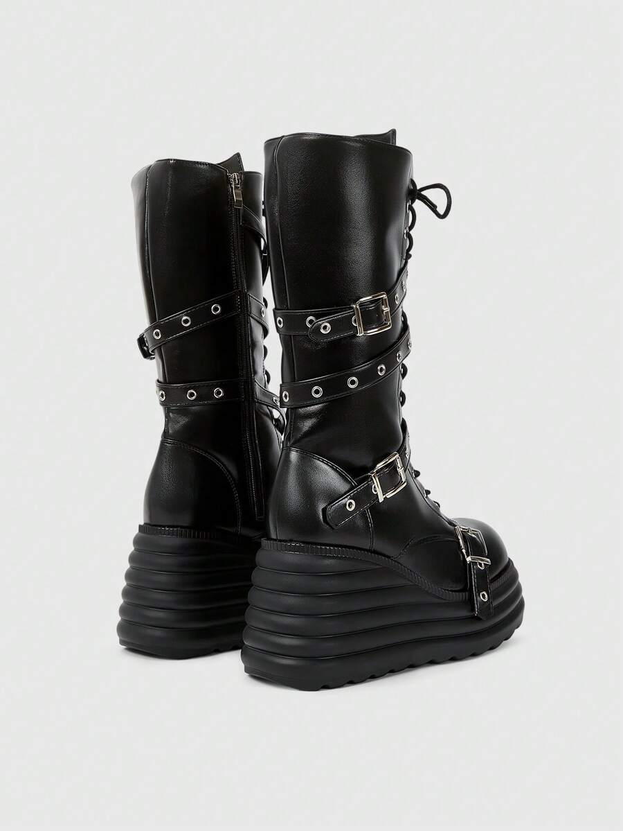 Grunge Punk Women's Punk Style Metal Eyelet Multi-Strap Round Toe Platform Thick Sole PU Leather Mid-Calf Boots, Black Metal Punk Casual School Wear