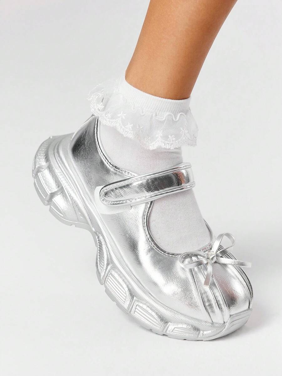 Grunge Punk Women's Silver Ballet Dance Shoes With Hook And Loop Strap Decor, Mary Janes, Bow Accent, JK School Uniform Casual Oxfords, Platform & Wedge Heels