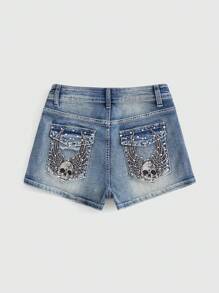 Grunge Punk Women's Skull Embroidery Rhinestone Decoration Elastic Skinny Denim Shorts
